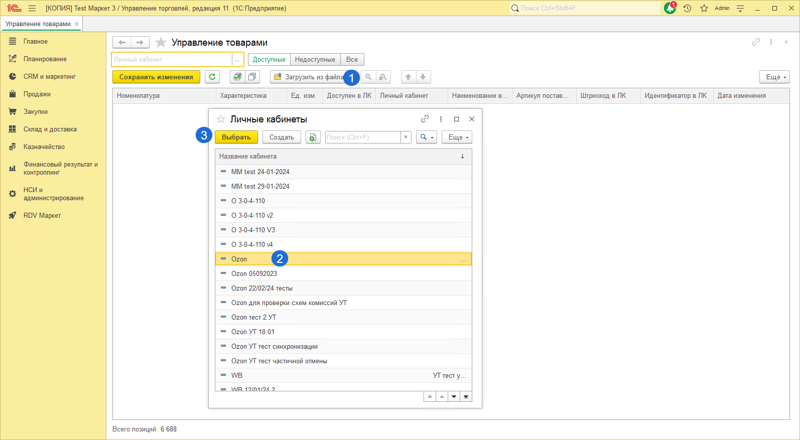 Загрузить данные о новых товарах можно, нажав на кнопку "Загрузить из файла"(1), после чего выбрать ЛК Оzon(2) и нажать на кнопку "Выбрать" (3). Если в отборе уже указан один кабинет, то при нажатии на кнопку "Загрузить из ЛК" выполнится загрузка по отобранному кабинету.