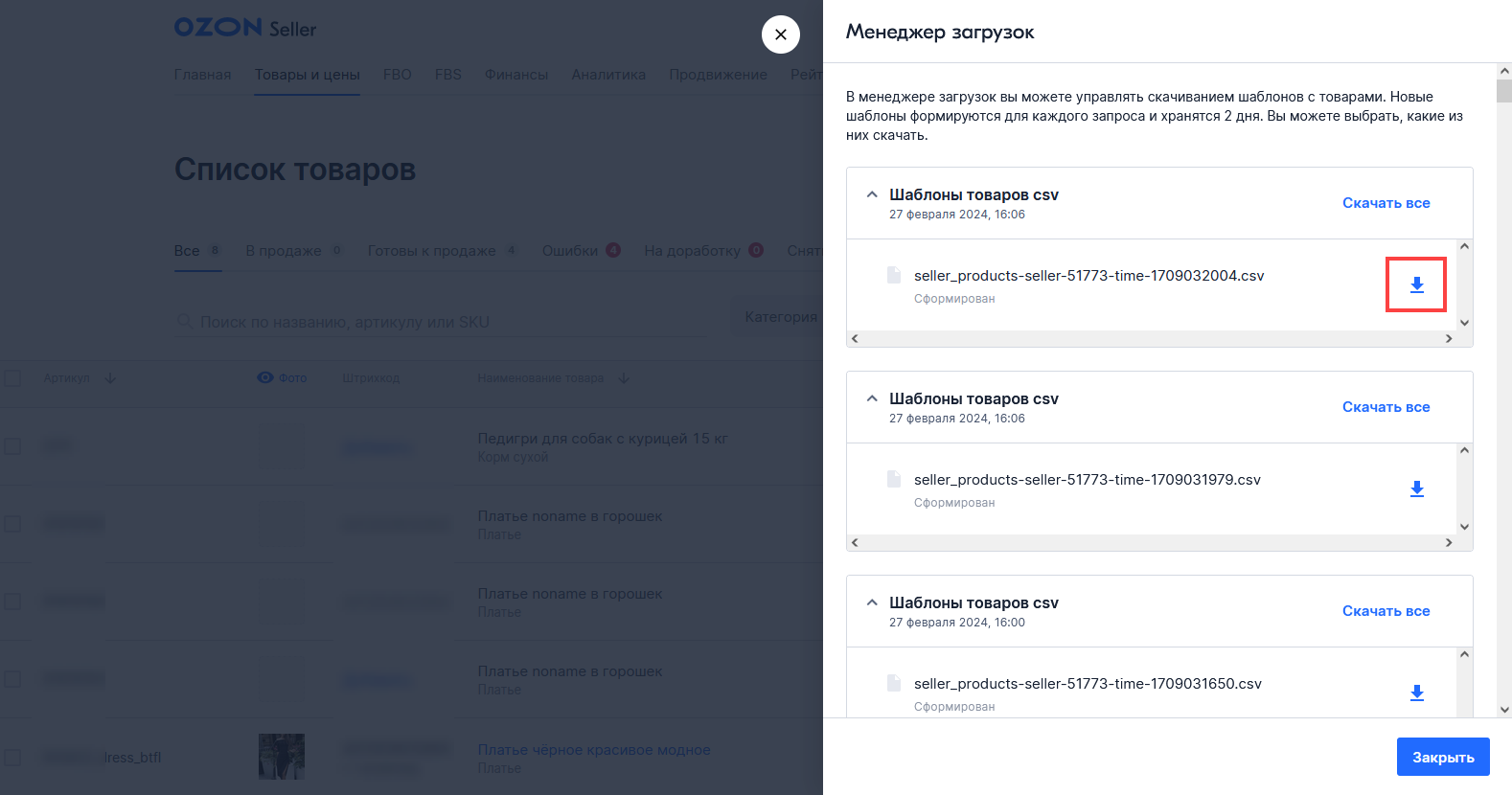 - Cкачать файл с товарами из личного кабинета с новыми данными по товару.