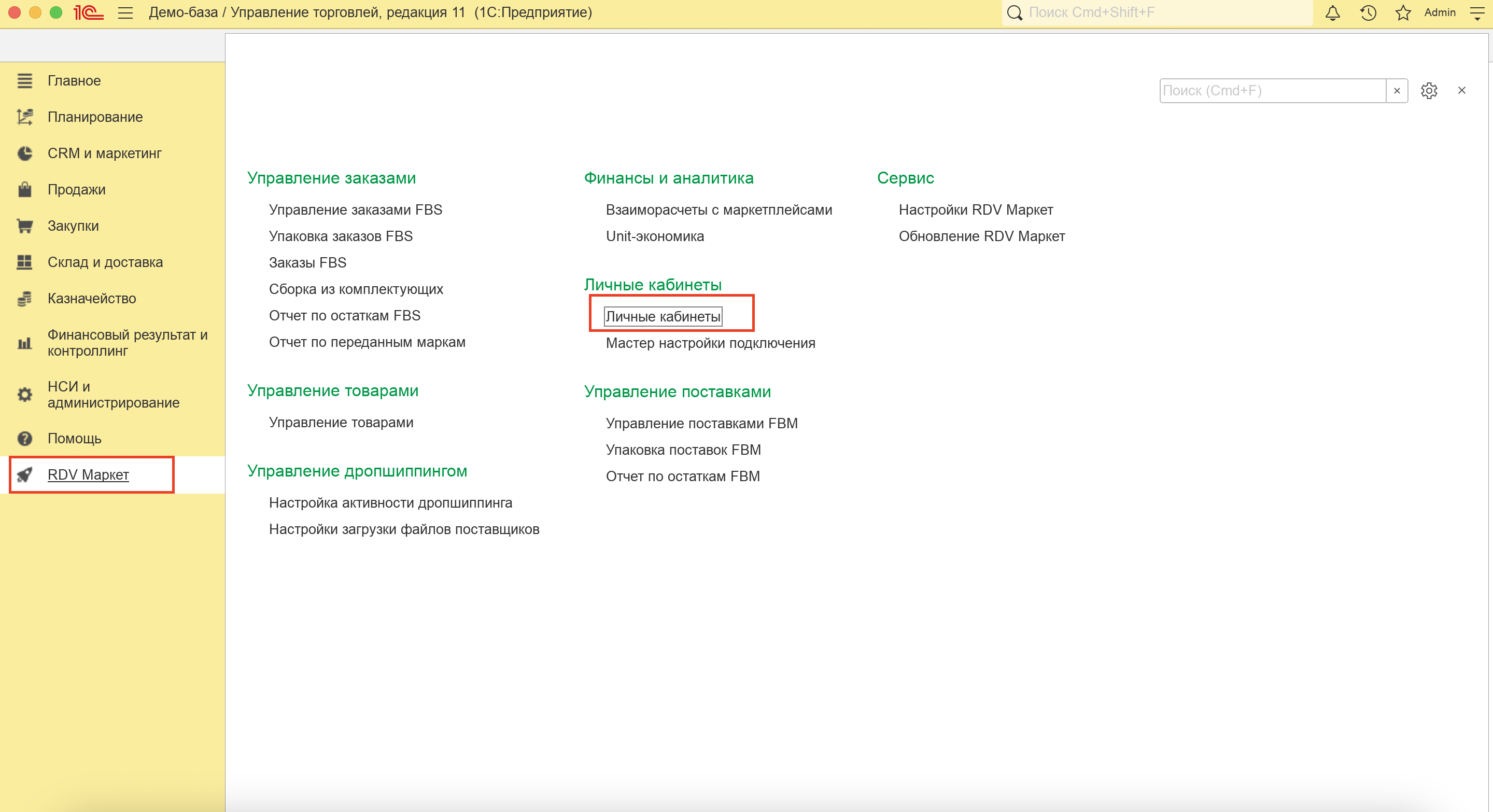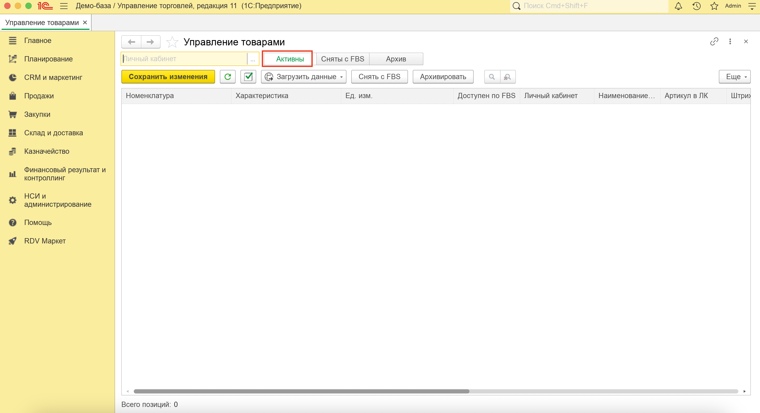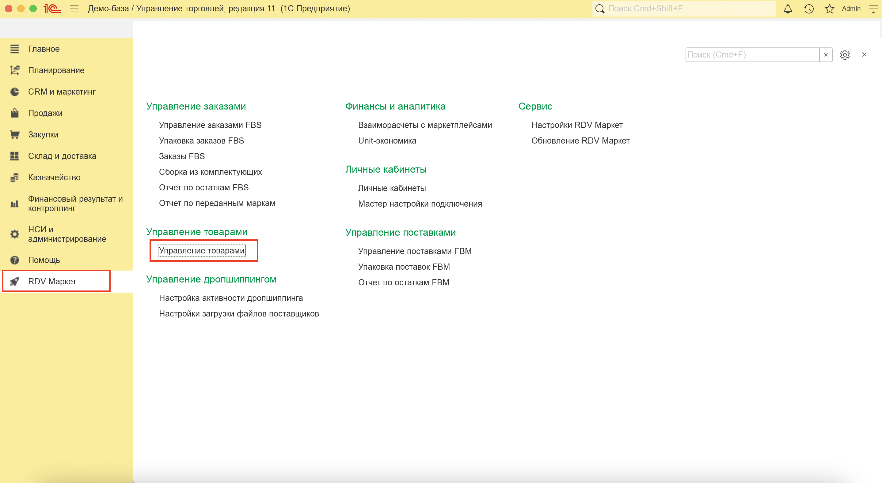 Работа с товарами осуществляется в разделе "RDV Маркет" - "Управление товарами":
