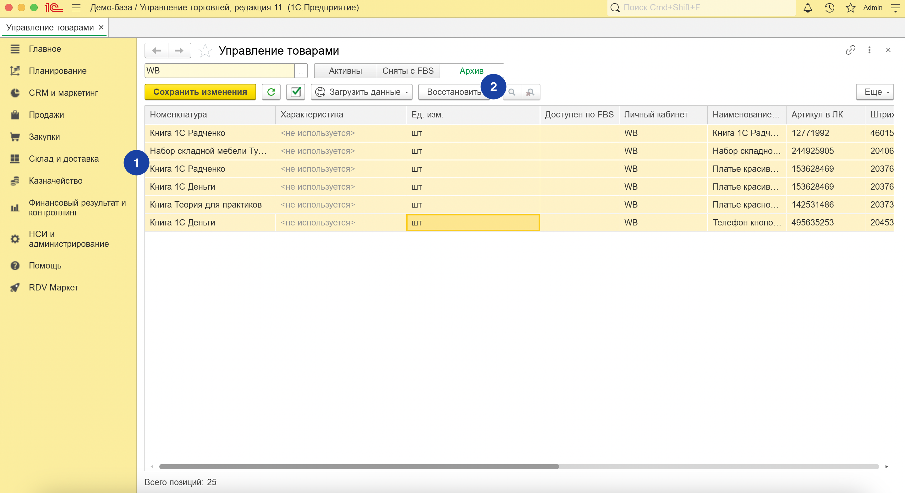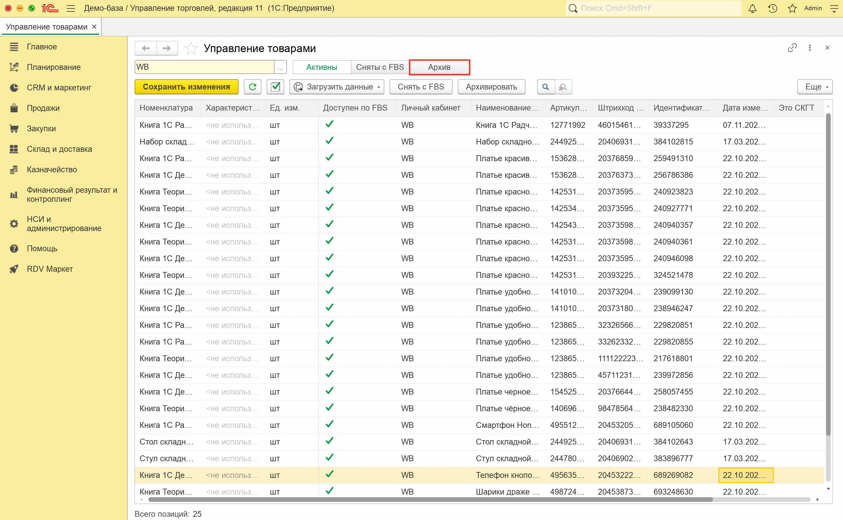 Функция "Архив" позволяет убирать из основного списка карточки, которые больше не продаются на маркетплейсах, и хранить их отдельно от актуальных товаров.