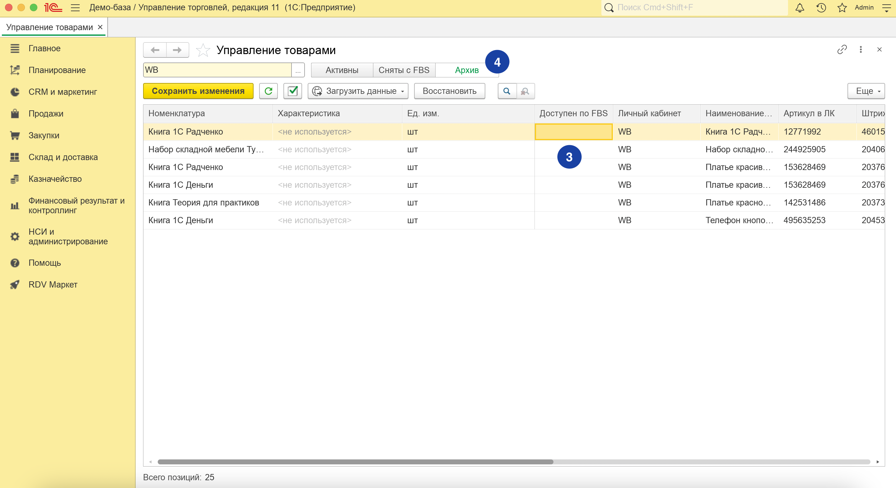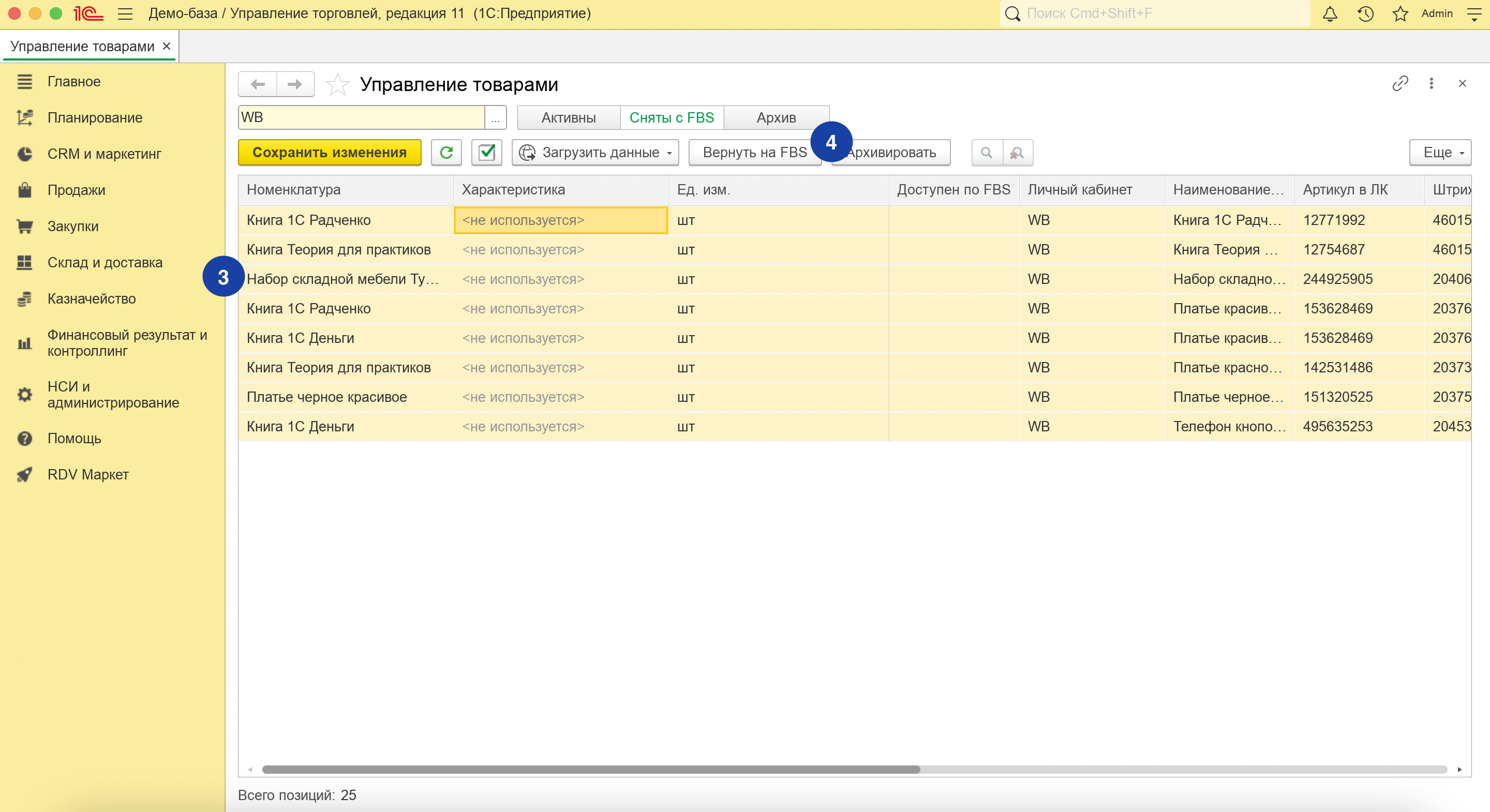 Снять доступность товара для отключения продажи в ЛК можно, если снять флаг "Доступен по FBS". Снять флаг можно как по конкретным товарам, так и по нескольким, воспользовавшись фильтрами из каждого столбца табличной формы (Номенклатура, ЛК, Артикул поставщика и т.д.).