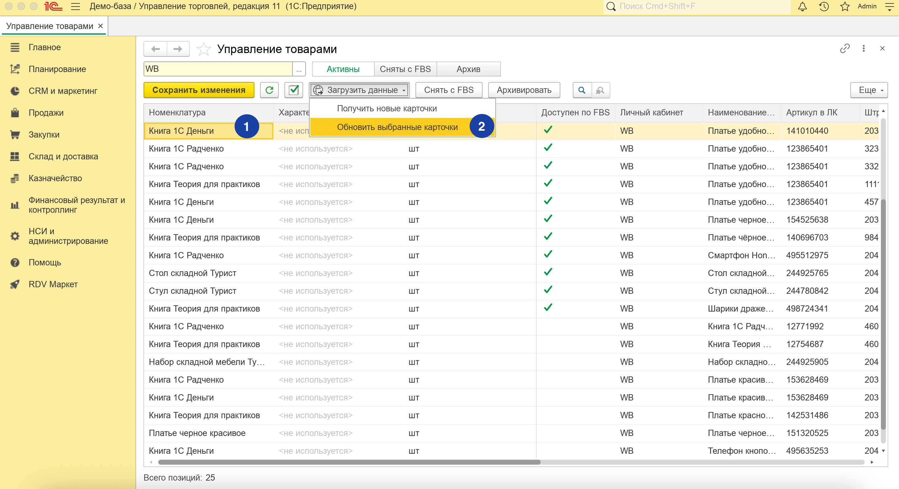 В списке карточек выбрать позиции, для которых требуется актуализация данных.