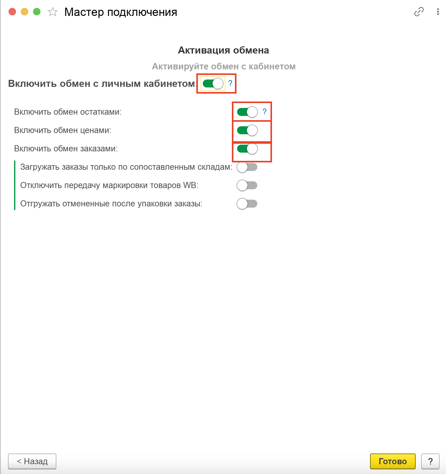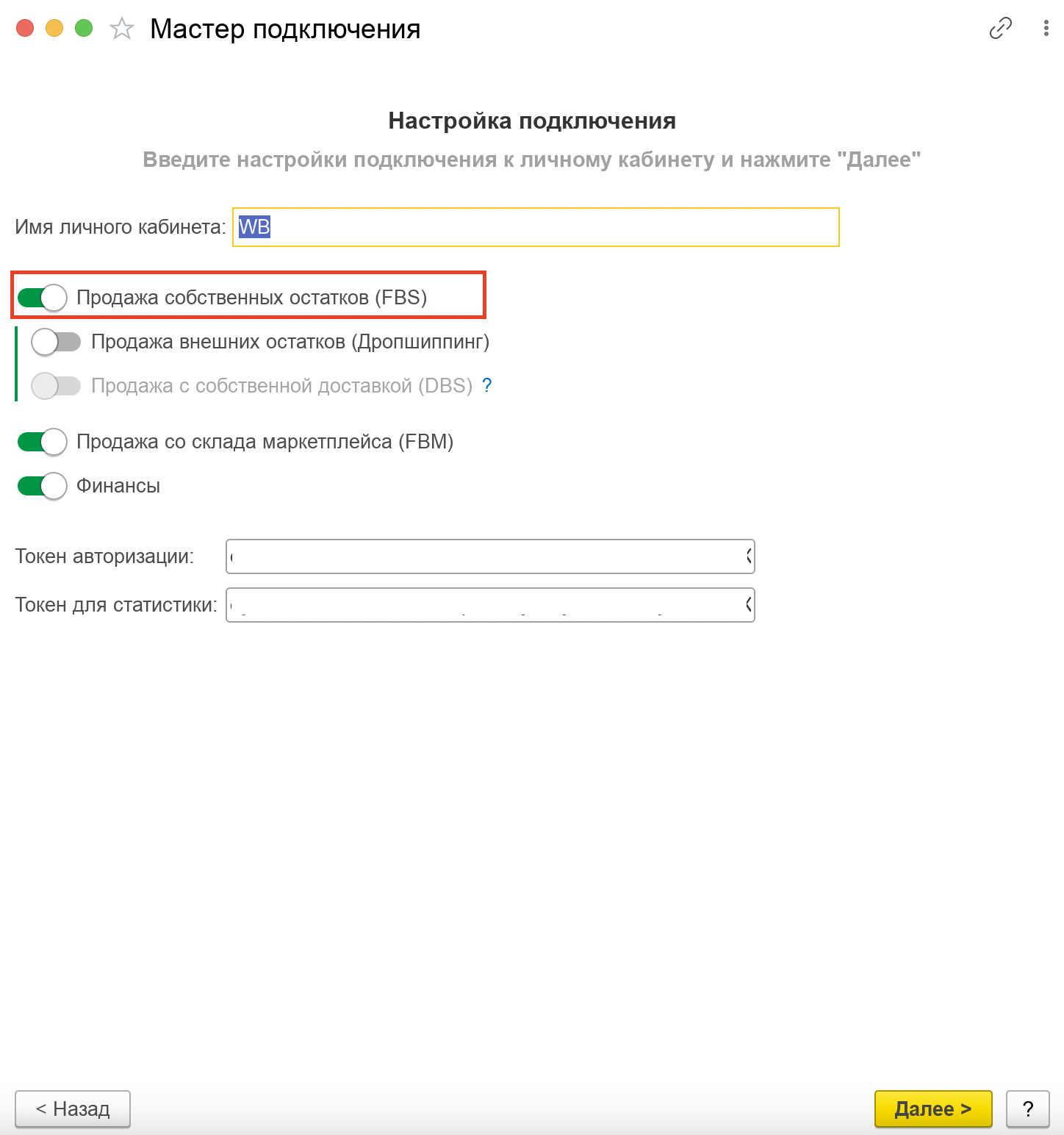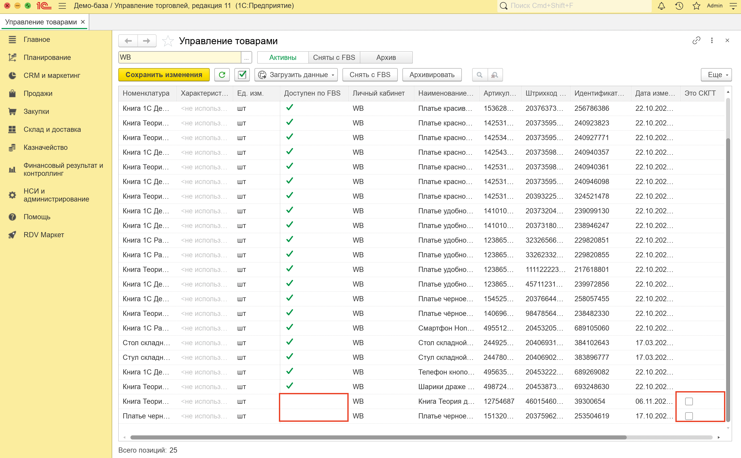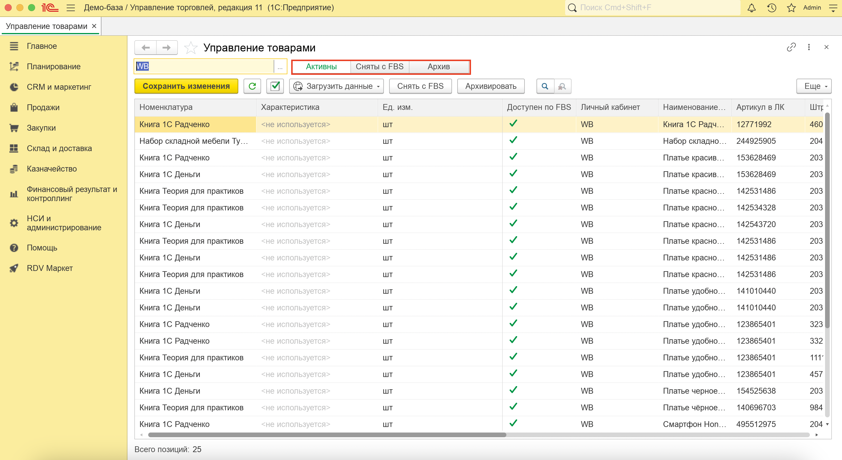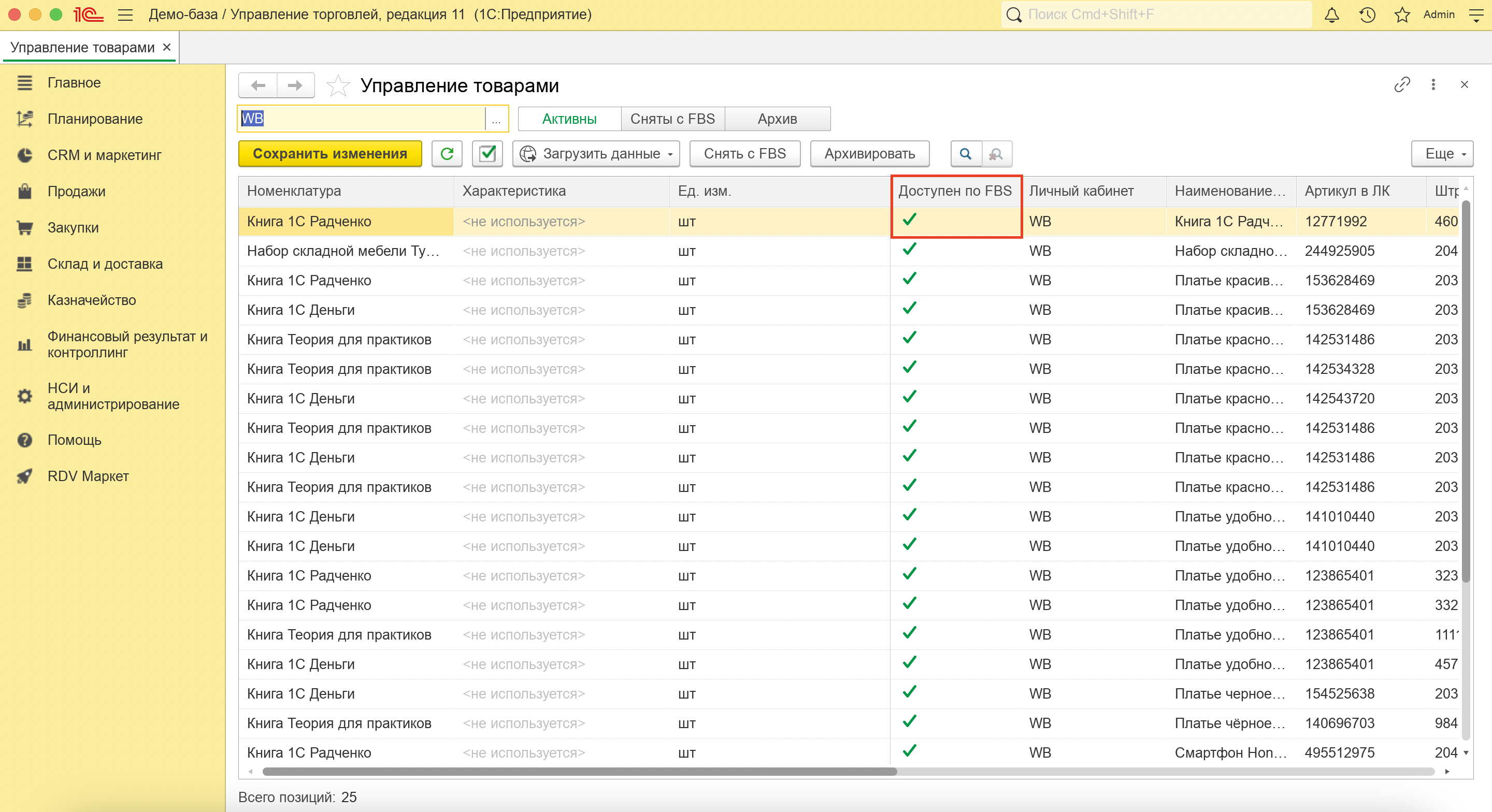 В форме "Управление товарами" есть признак "Доступен по FBS". Когда данный признак включён (установлен зелёный флаг), то по товару осуществляется передача информации о ценах и остатках на МП Wildberries.