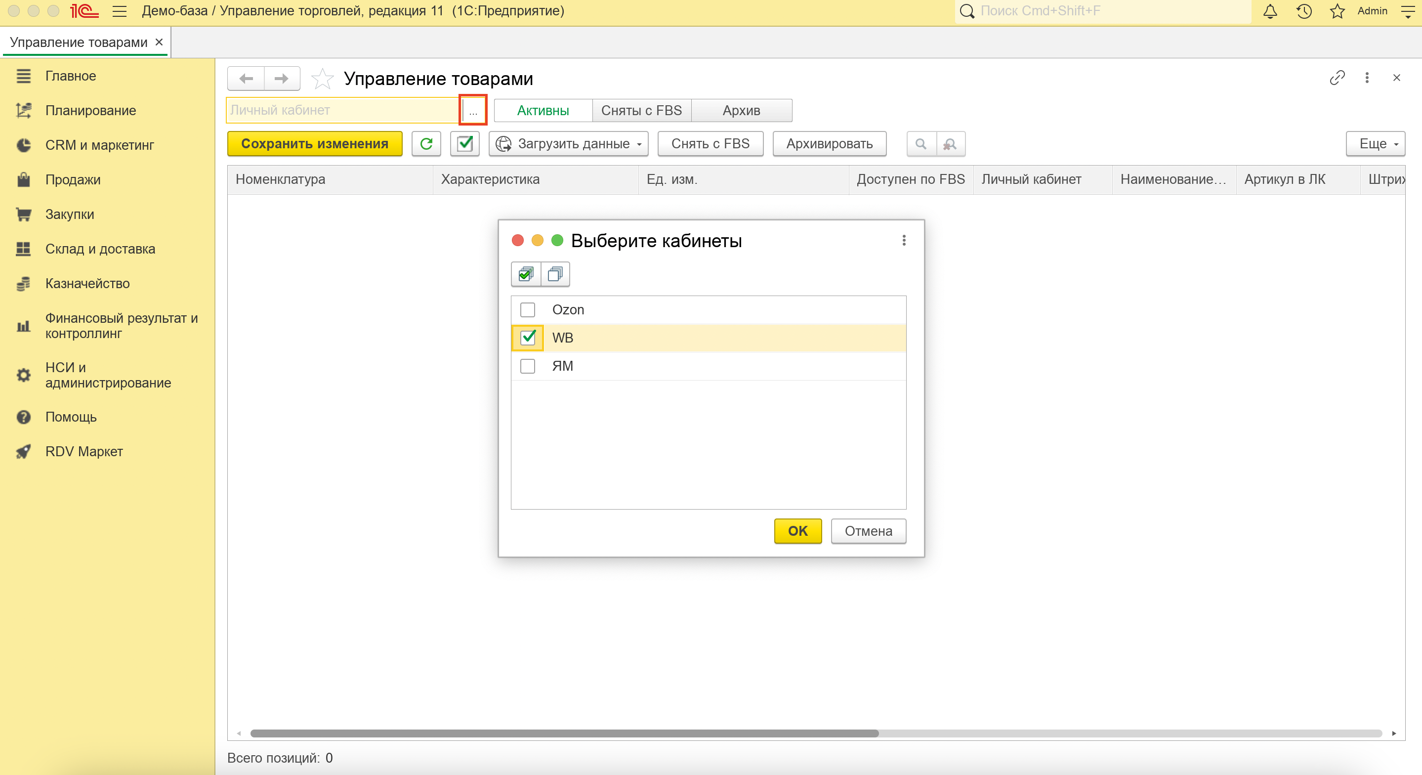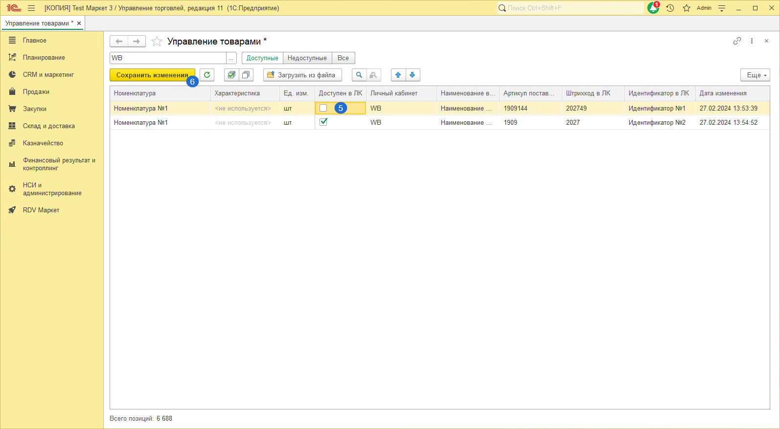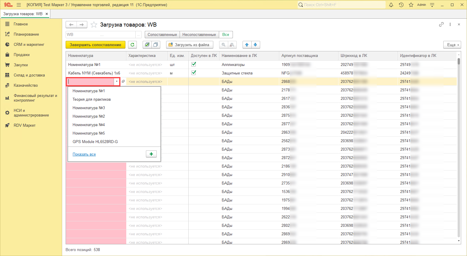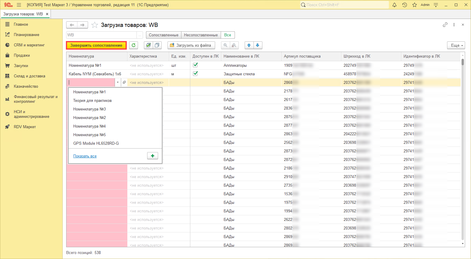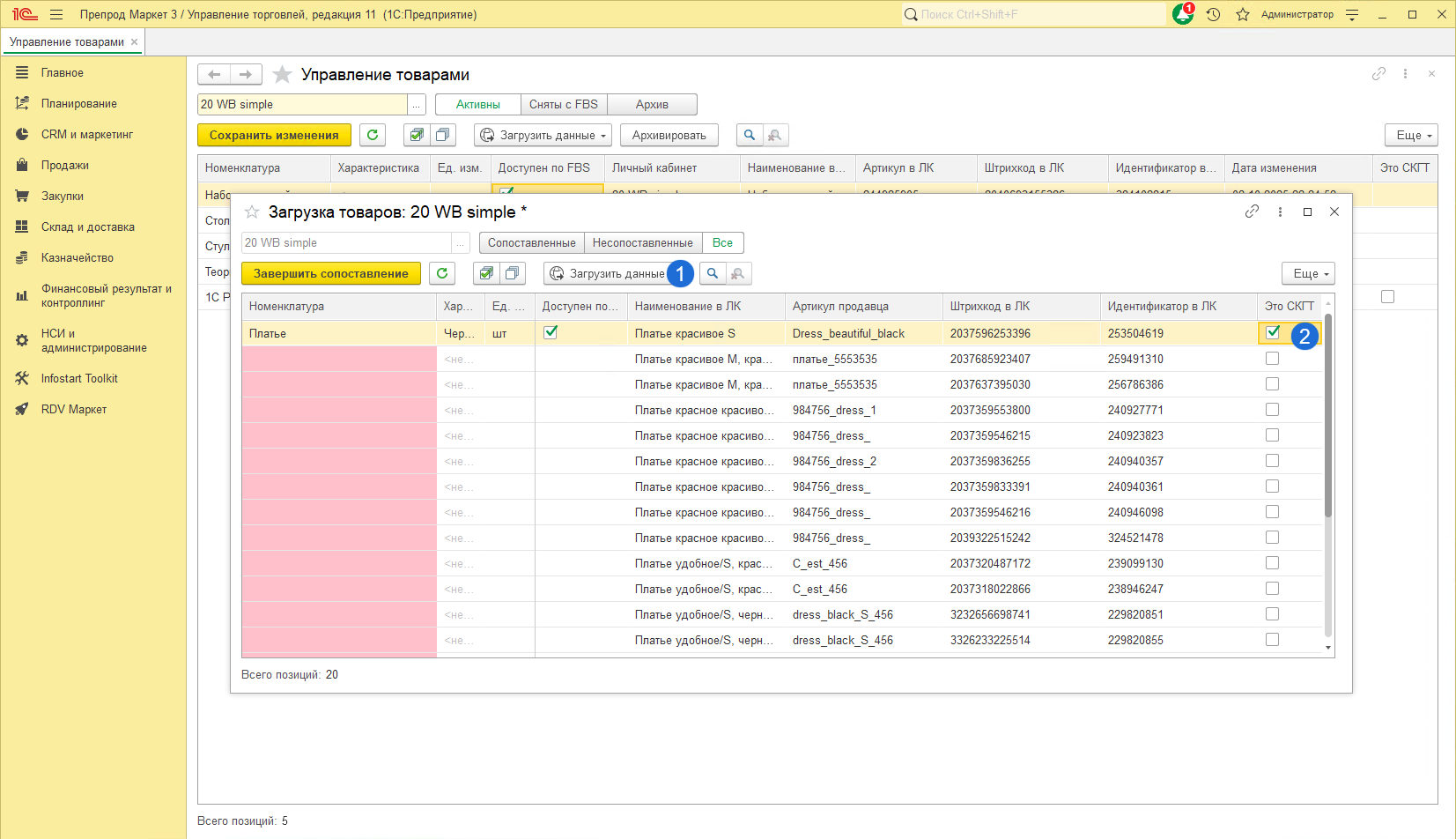 Товары МП сопоставляются с номенклатурой в 1С в соответствии с характеристиками и упаковками (если в базе ведётся учёт по данным признакам).