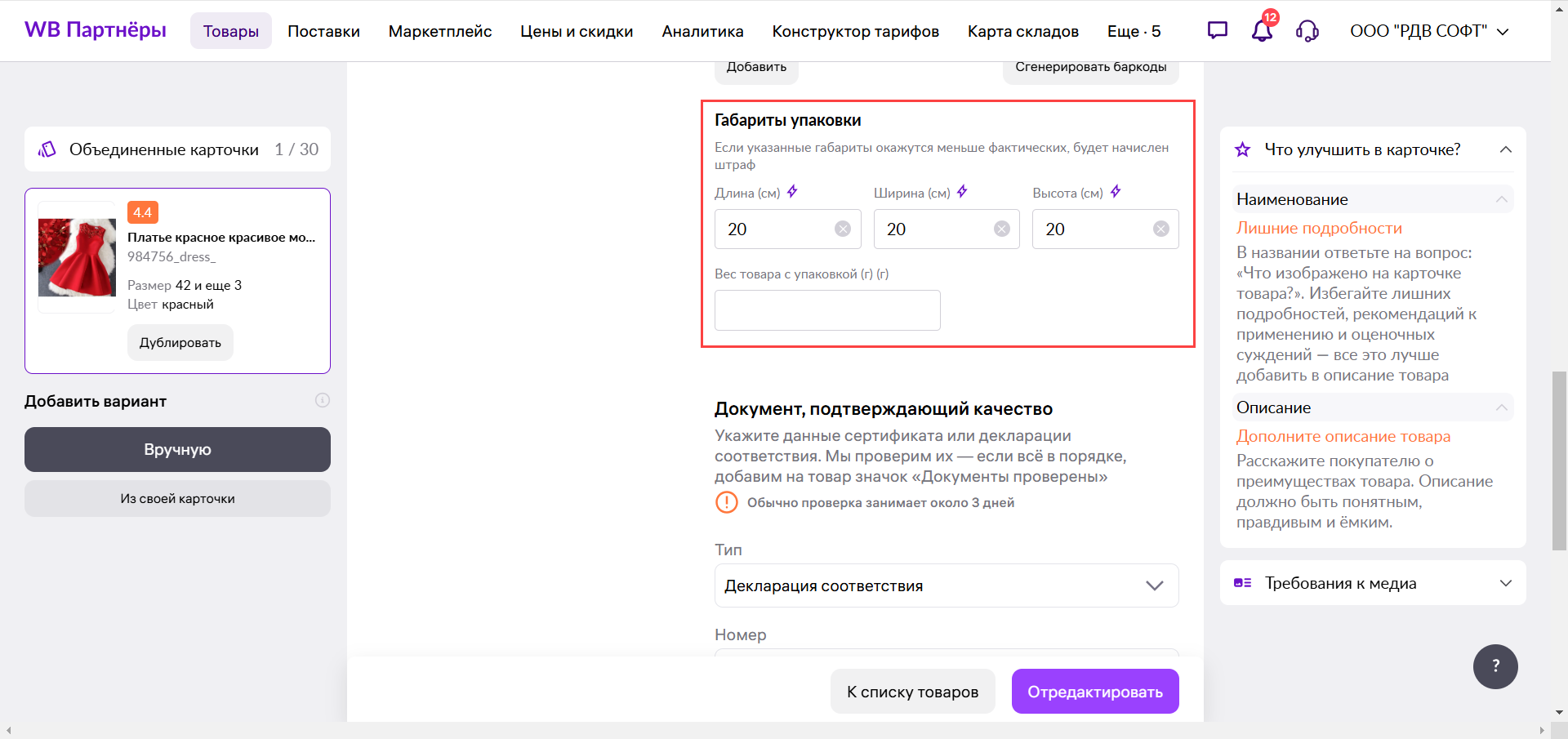В ЛК ВБ в карточке товара должны быть указанные соответствующие СКГТ товарам весогабариты: