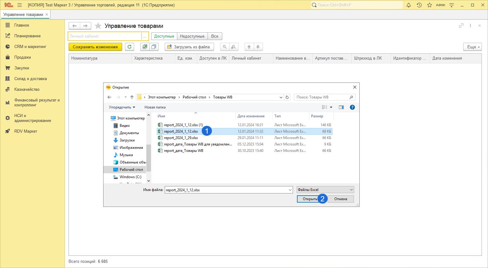 Выберете файл выгруженный из ЛК с наименованием "report_ГГГГ_ММ_ДД.xlsx"(1) и нажмите на кнопку "Открыть"(2) или клавишу "Enter":