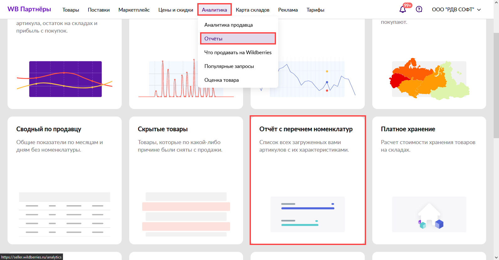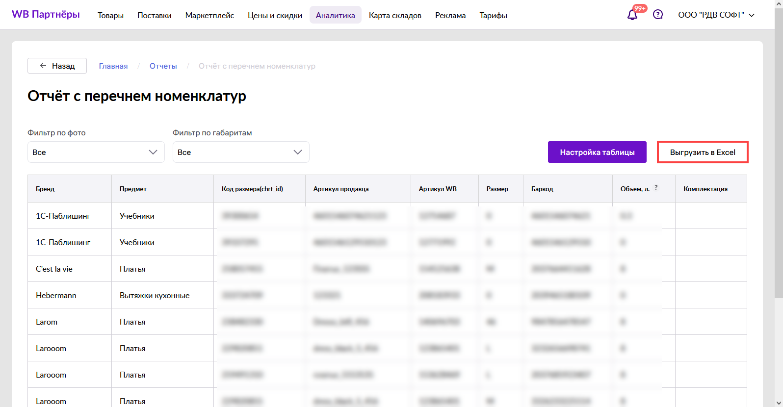 Скачайте файл с товарами из ЛК Wildberries. Для этого перейдите в личный кабинет, в раздел "Аналитика" - "Отчёты" и выберите "Отчёт с перечнем номенклатур".