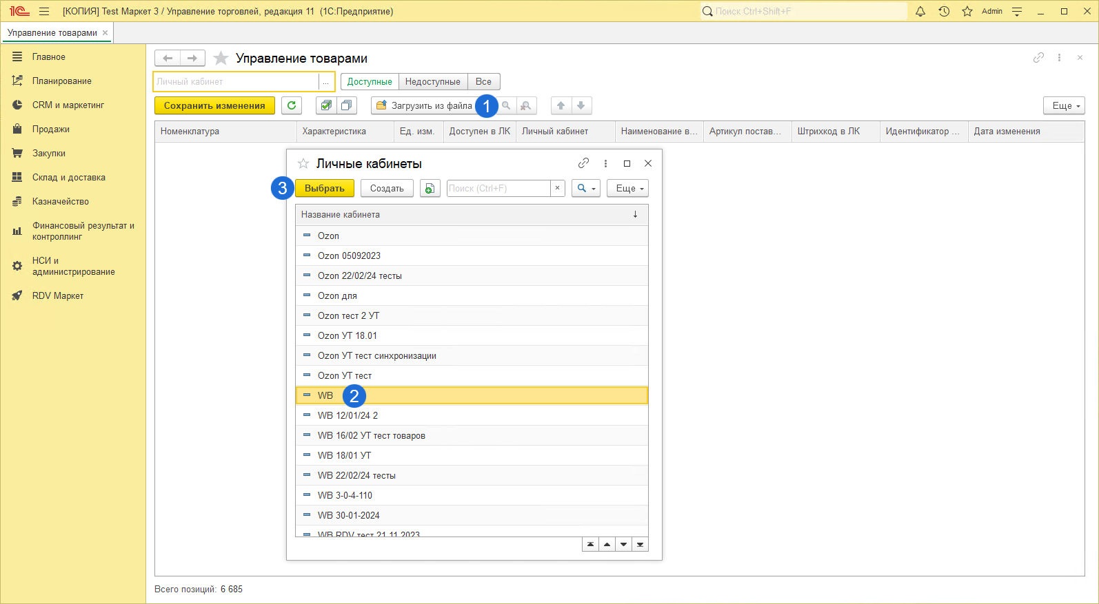 Загрузить данные о новых товарах можно, нажав на кнопку "Загрузить из файла"(1), после чего выбрать ЛК Wildberries(2) и нажать на кнопку "Выбрать" (3). Если в отборе уже указан один кабинет, то при нажатии на кнопку "Загрузить из ЛК" выполнится загрузка по отобранному кабинету.