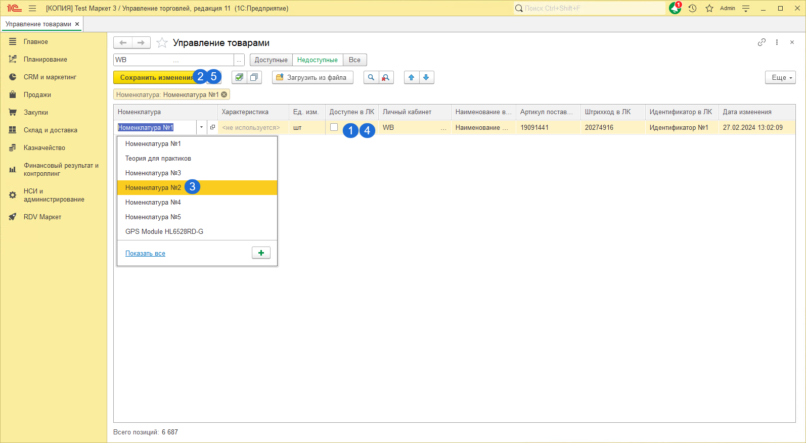В случае, если номенклатура не сопоставилась автоматически, номенклатуру из 1С можно подставить вручную.