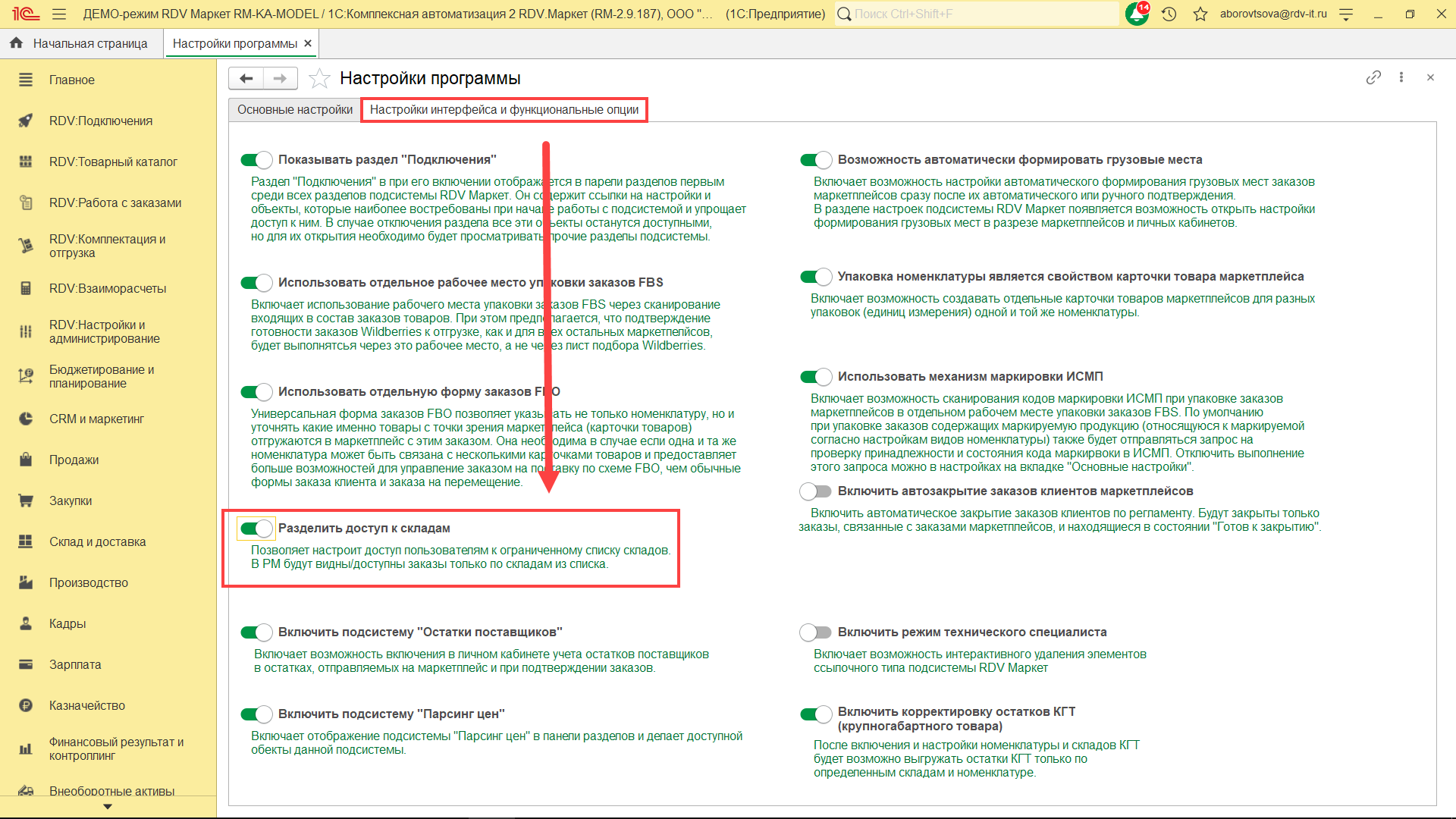 Если вы хотите разделить работу на складе для разных пользователей (например, если у каждого склада свой кладовщик и нужно, чтобы он видел заказы только для своего склада), то перейдите в раздел "RDV: Настройка и администрирование" - "Настройка программы" и на вкладке "Настройки интерфейса и функциональные опции" включите параметр "Разделить доступ к складам":