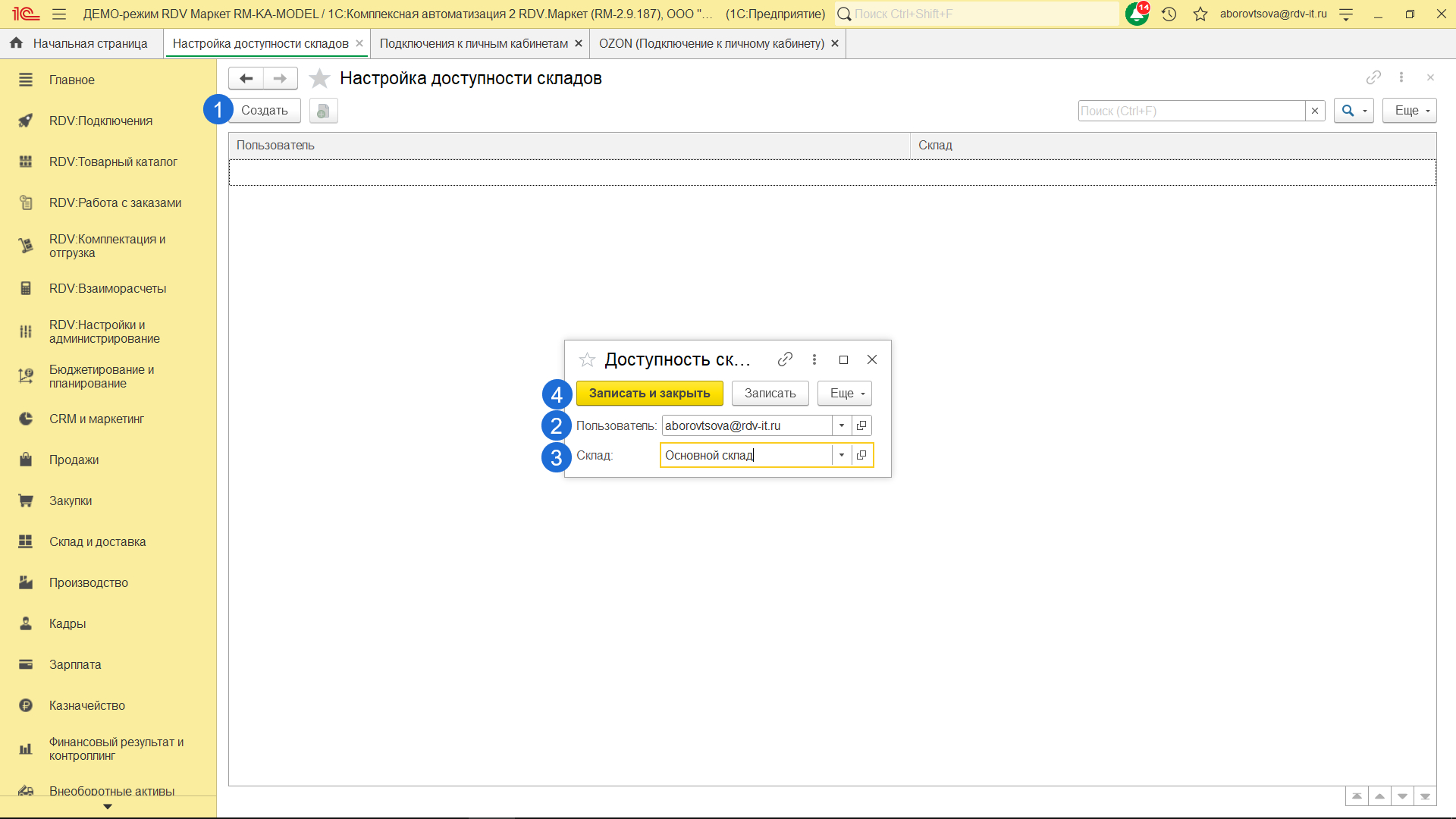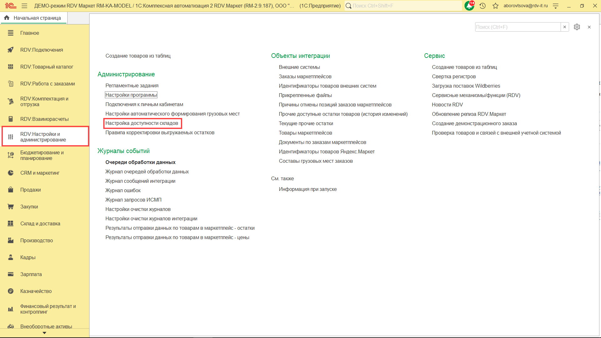 Далее перейдите в раздел "RDV: Настройка и администрирование" - "Настройка доступности складов" для настройки доступа к складам: