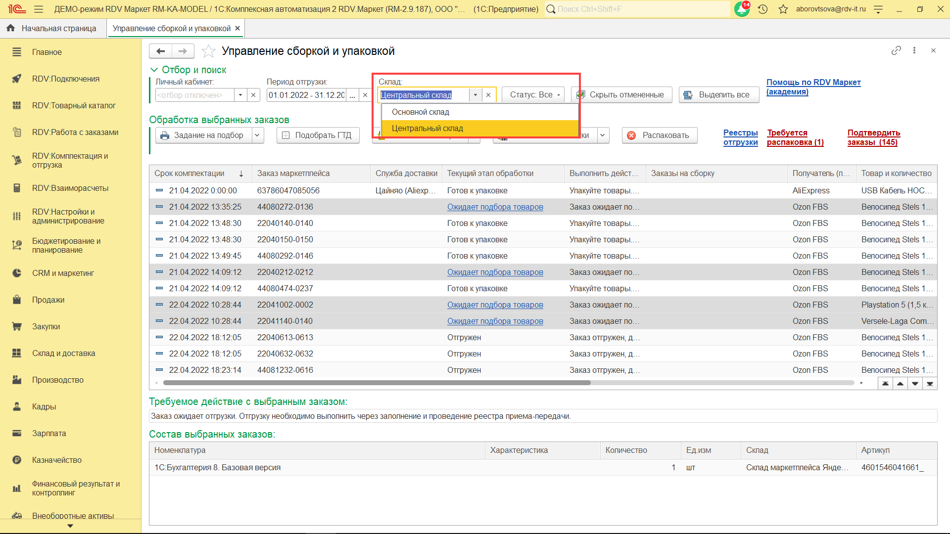 После установки настроек в форме "Управление сборкой и упаковкой" пользователь будет видеть только заказы по складам, к которым ему разрешён доступ. В форме "Рабочее место упаковки заказов", при сканировании товара, система также будет искать заказы только по тем складам, к которым у пользователя есть доступ: