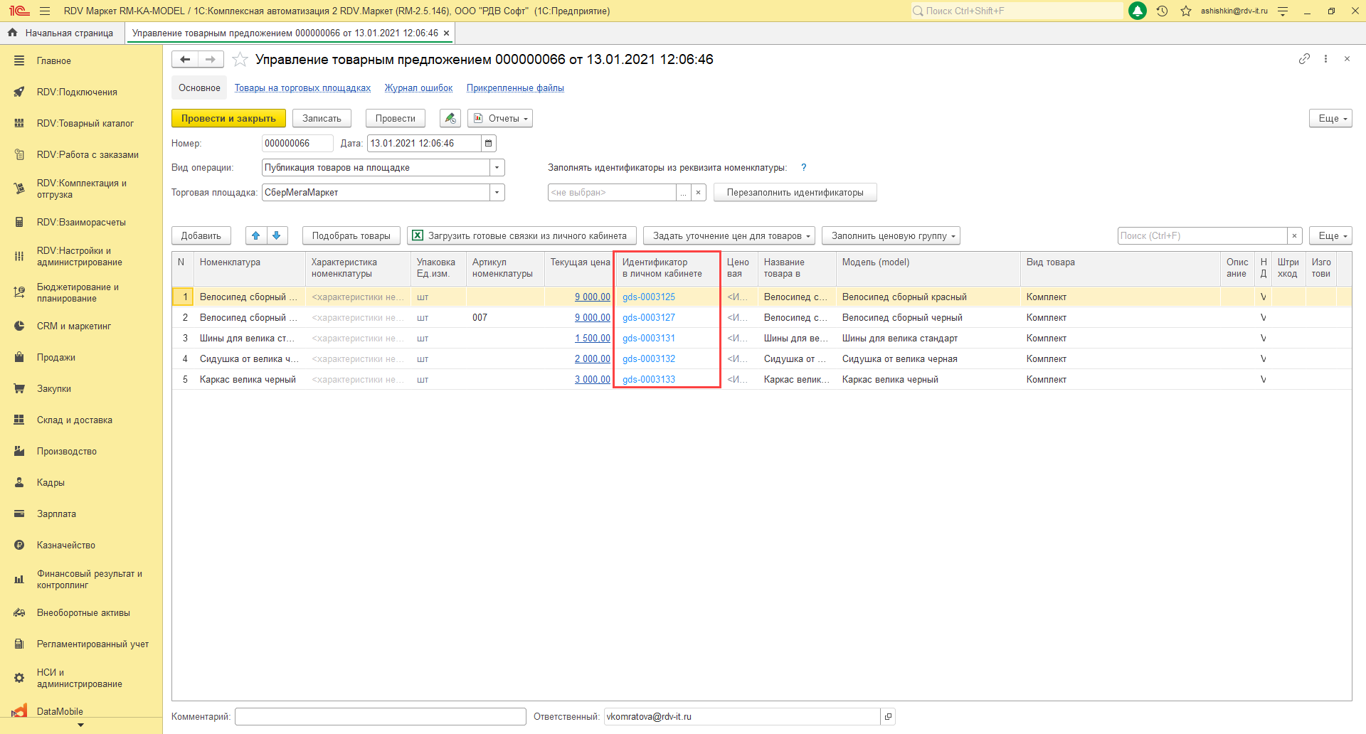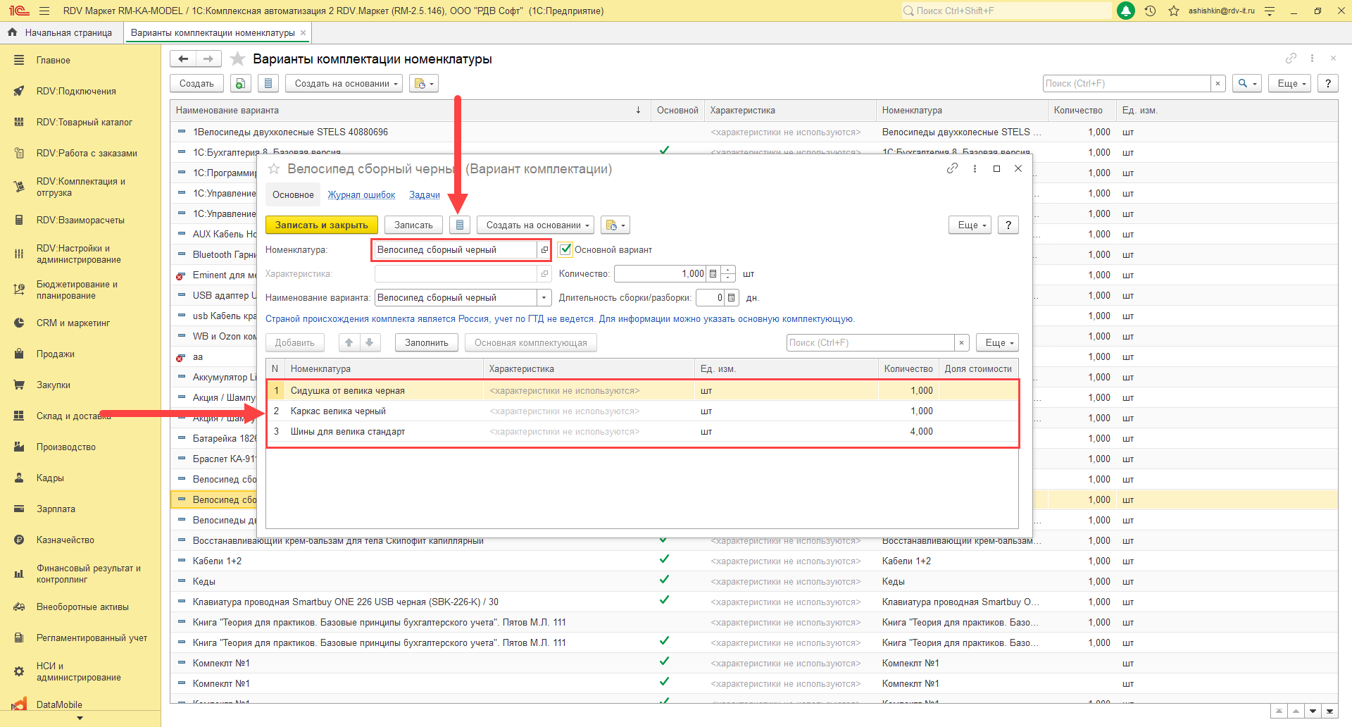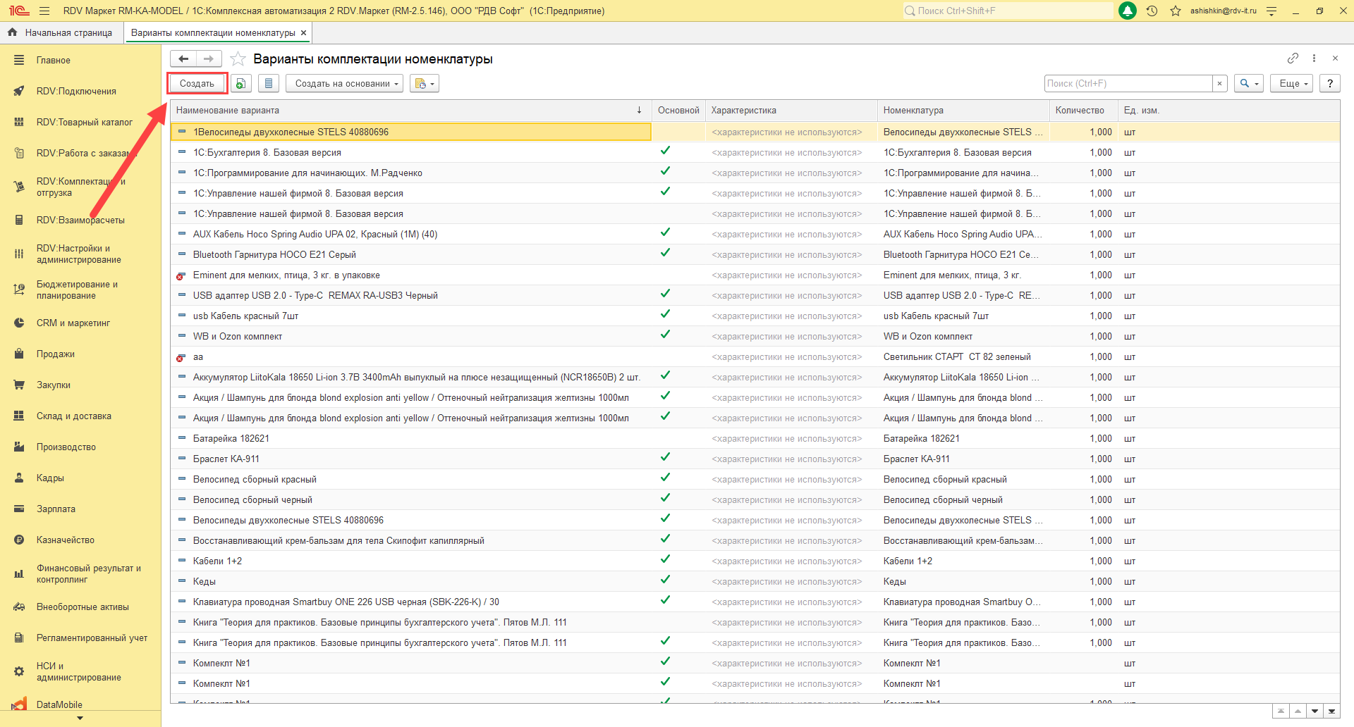 2. Открыть варианты комплектации в разделе "RDV:Товарный каталог - Варианты комплектации номенклатуры". Данный раздел становится доступным после установки флага "Учитывать комплектующие товаров по основному варианту комплектации" в настройках подключения к ЛК: