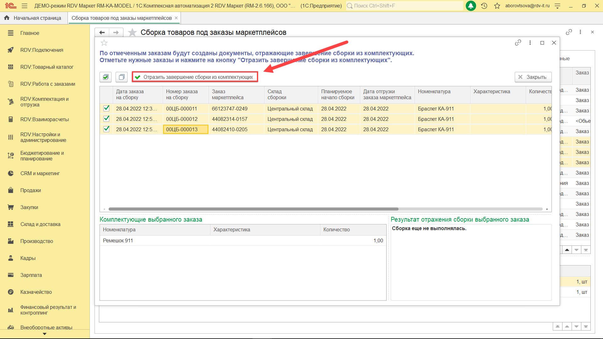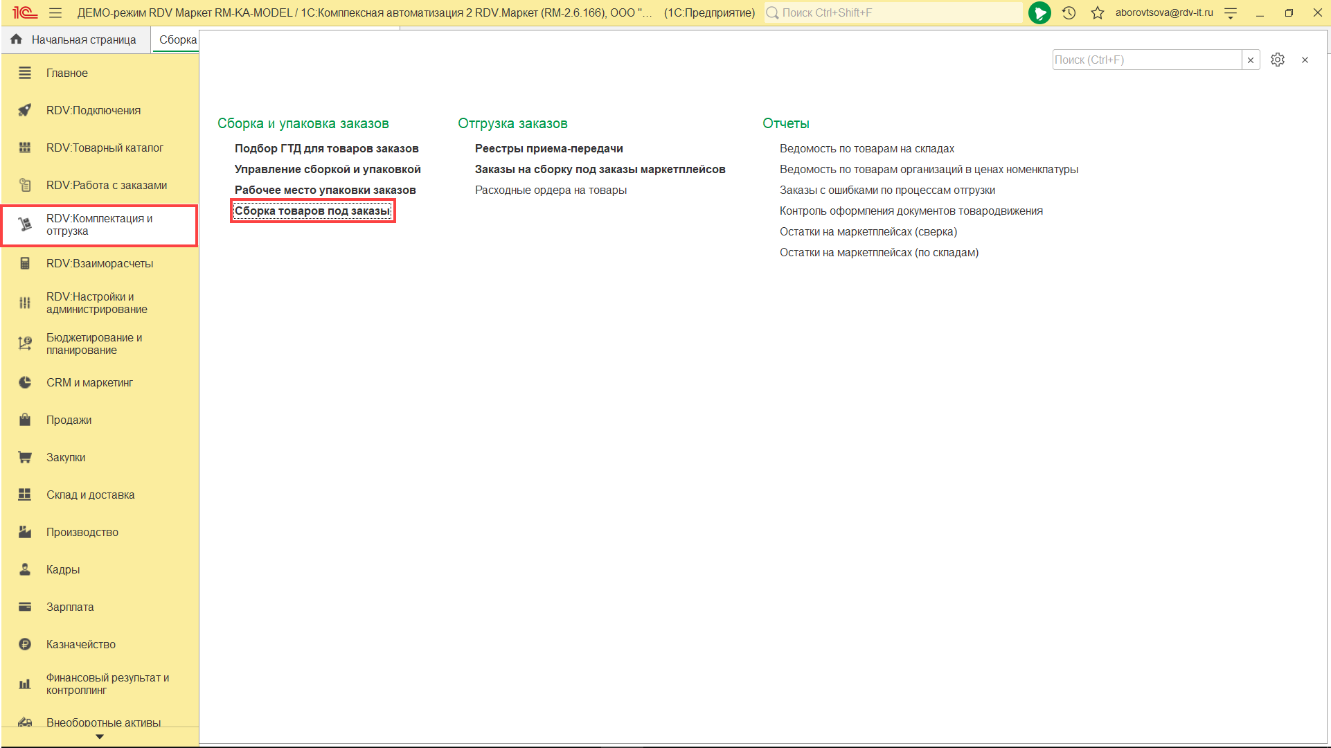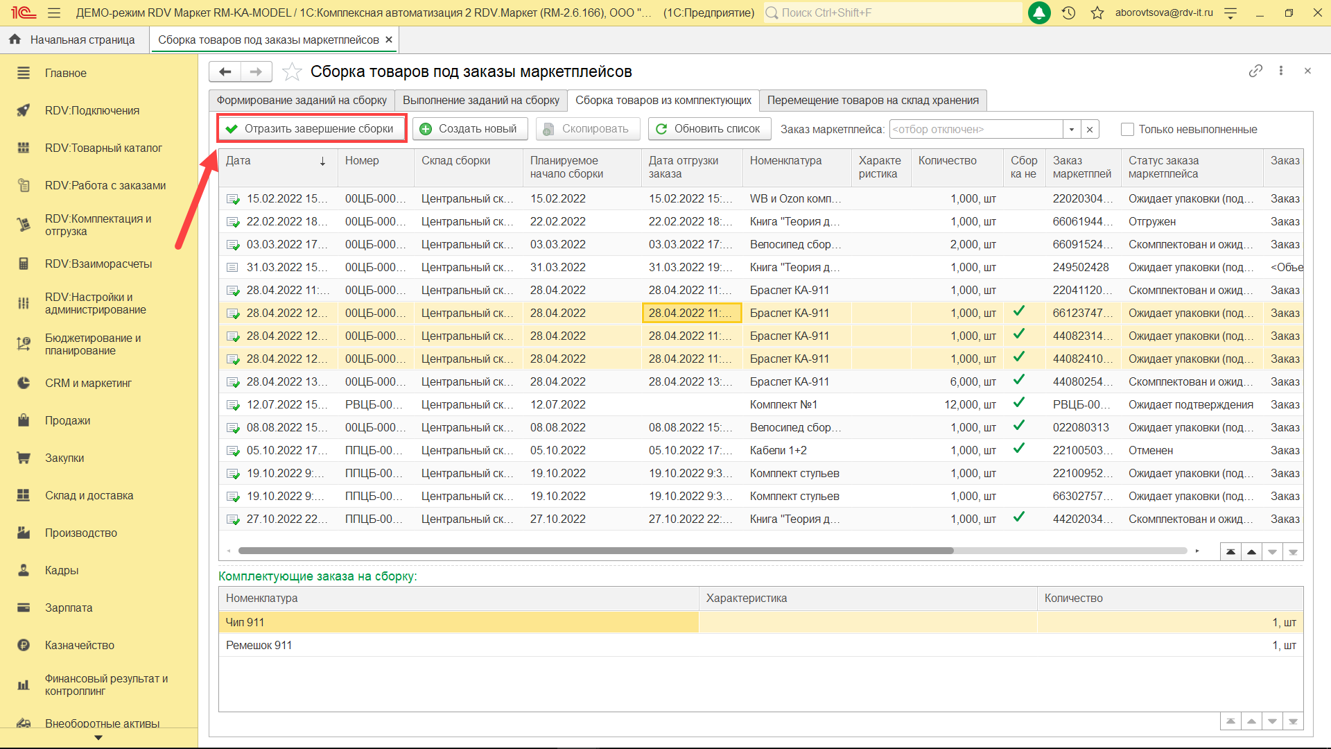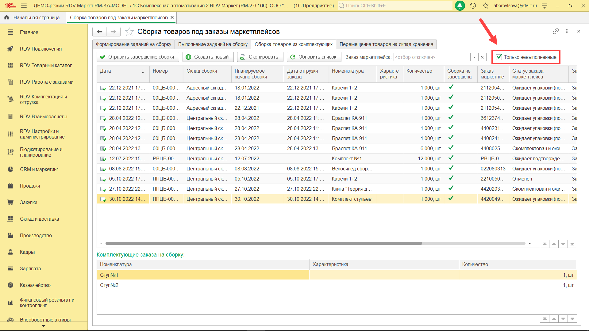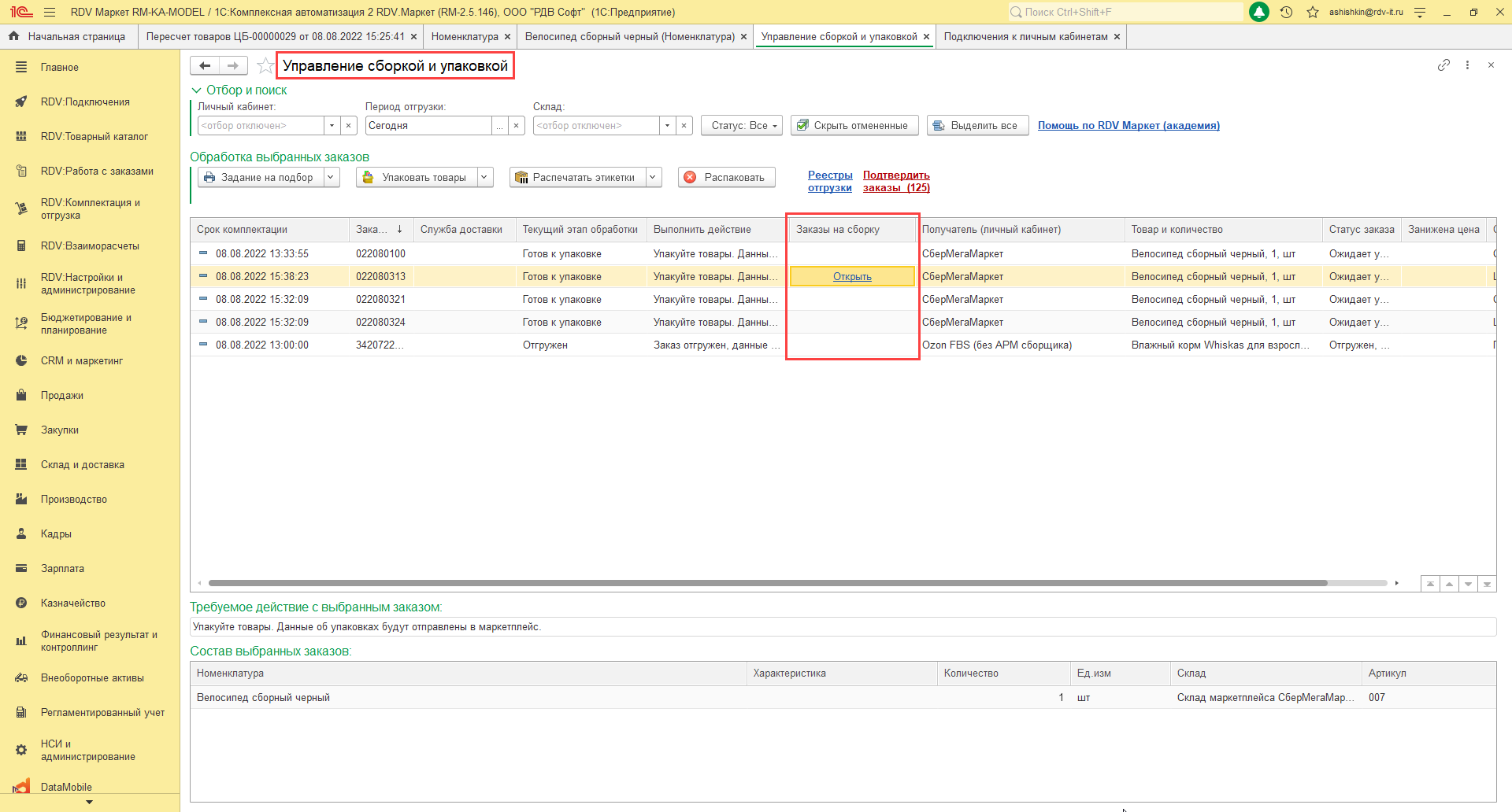 Также список заказов на сборку находится в разделе "RDV: Комплектация и отгрузка" - "Сборка товаров под заказы".