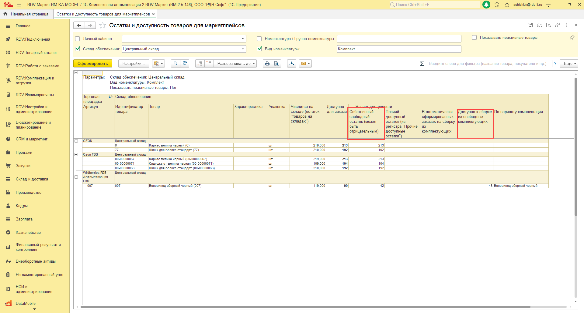 Данный отчет отображает доступное количество товаров на маркетплейсе. Например, товар "Велосипед сборный черный" доступен для заказа в количестве 90 шт. - 42 шт. собственных остатков и 48 шт. на основании остатков комплектующих: