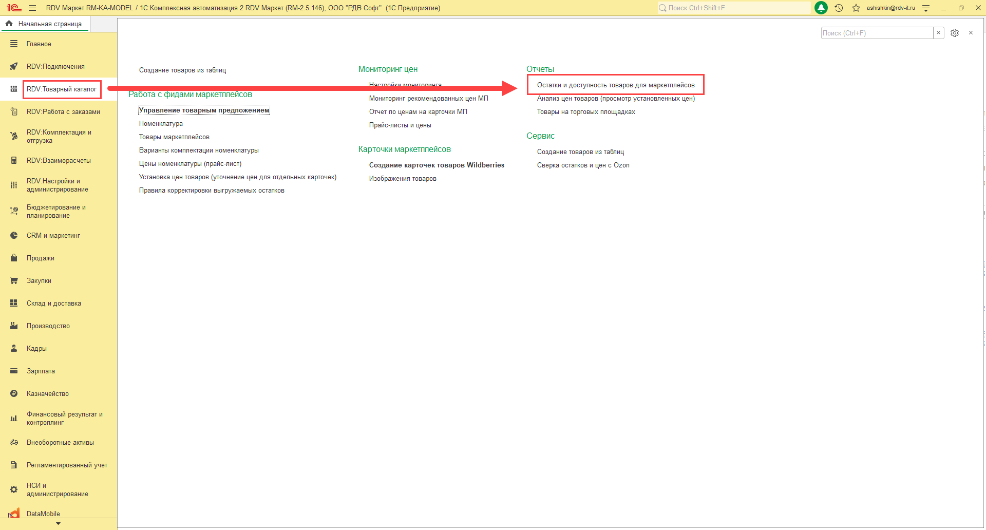 Можно отслеживать остатки, переданные на маркетплейс, через отчет "Остатки и доступность товаров для маркетплейсов" в разделе "RDV: Товарный каталог":
