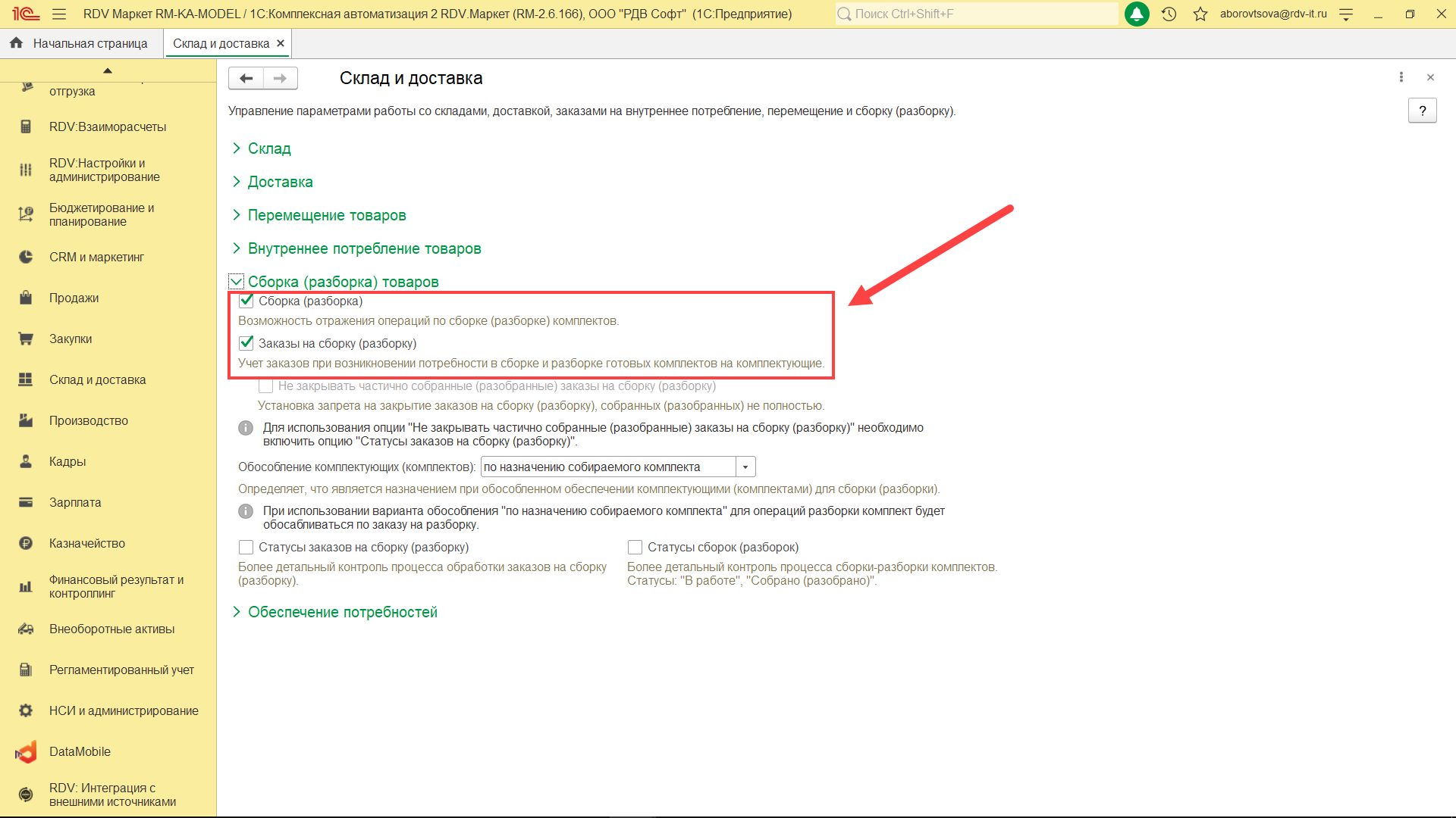 1. В разделе "НСИ и администрирование" - "Склад и доставка" на вкладке "Сборка (разборка) товаров" установить флаги "Сборка (разборка)" и "Заказы на сборку (разборку)".