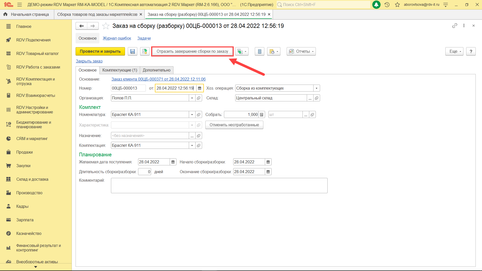 Также Вы можете выполнить сборку, зайдя в сам заказ на сборку и нажав на кнопку "Отразить завершение сборки по заказу":