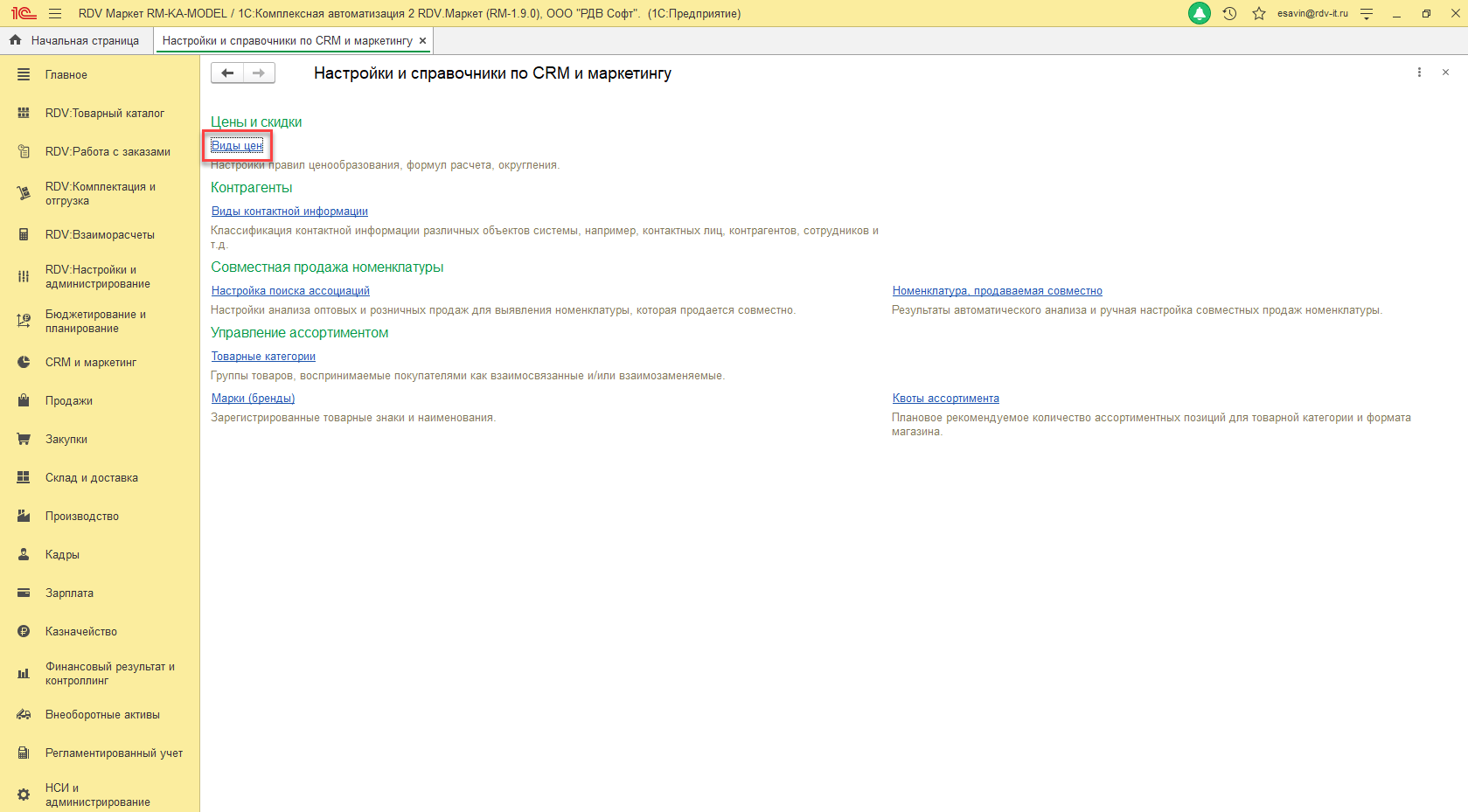 Для того, чтобы создать новый вид цен необходимо перейти в раздел CRM и маркетинг - Настройки и справочники.