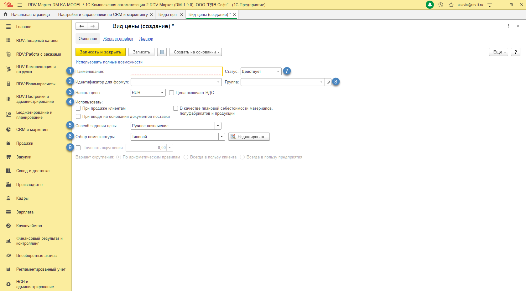 В открывшемся разделе перейти в меню Виды цен и нажать на кнопку Создать.