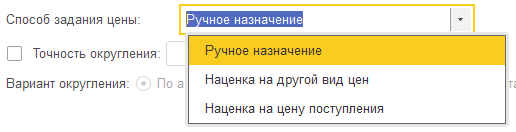 - ручное назначение (цену в документе "Установка цен номенклатуры" необходимо задавать вручную).