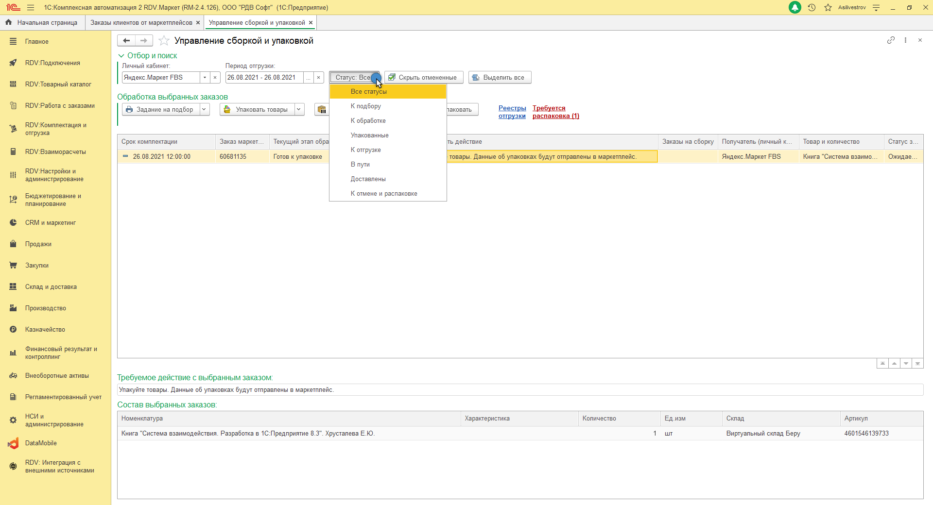 После этапа подтверждения заказа, начинаются процессы по сборке, комплектации, подготовке документов и этикеток, отгрузки заказов покупателям. Отследить процесс исполнения заказов можно по статусам сборки и комплектации складских ордеров: