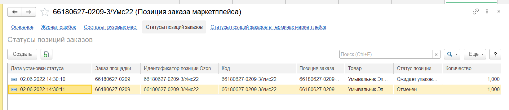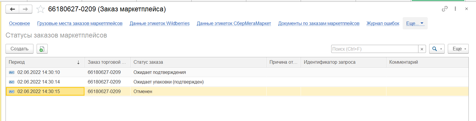 Для отмены заказ необходимо скорректировать статус заказа маркетплейса и статус позиции заказа - установить статус "Отменен"