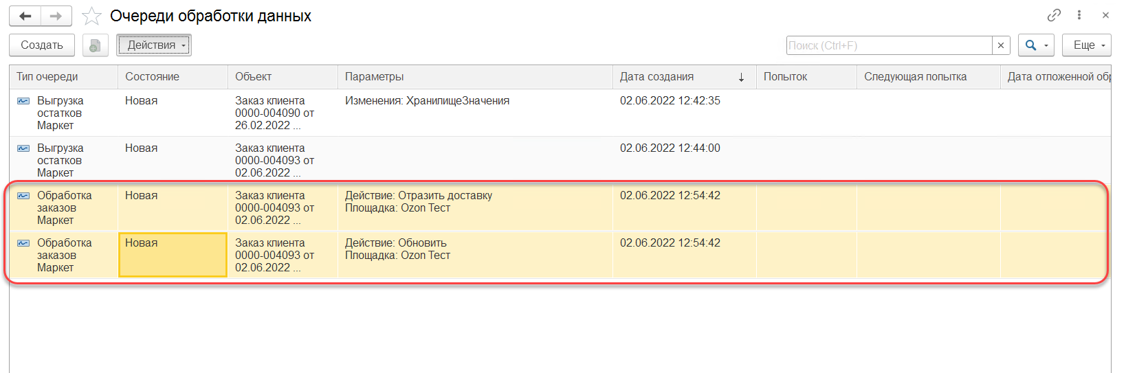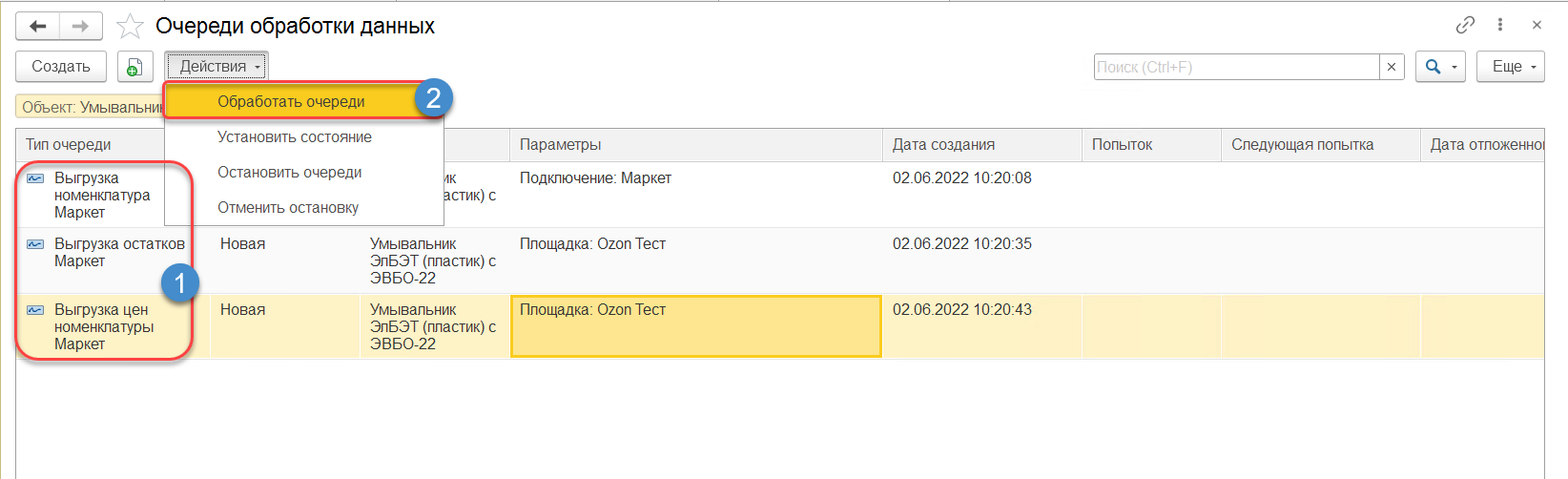 После выполнения регистрация в журнале "Очередь обработки данных" будут созданы очереди на отправку номенклатуры, цен и остатков (на рис. - 1). Данные очереди необходимо обработать, нажав кнопку "Действия" - "Обработать очереди" (на рис. - 2).