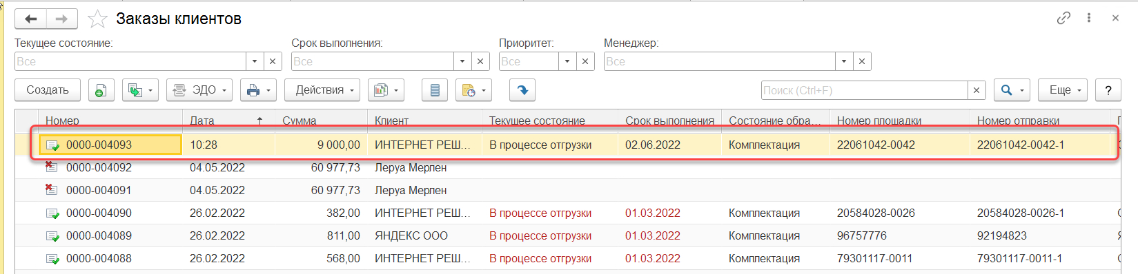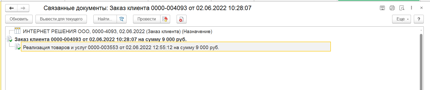 Далее необходимо проверить, чтобы на основании заказа была создана и проведена реализация.
