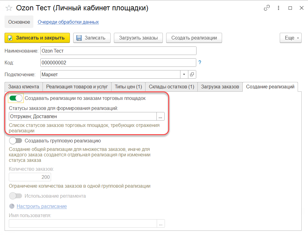 Для создания реализации необходимо в Коннекторе, в настройке личного кабинета, на вкладке "Создание реализаций", установить флаг "Создавать реализации по заказам торговых площадок" и выбрать статусы, при которых будут создаваться реализации.