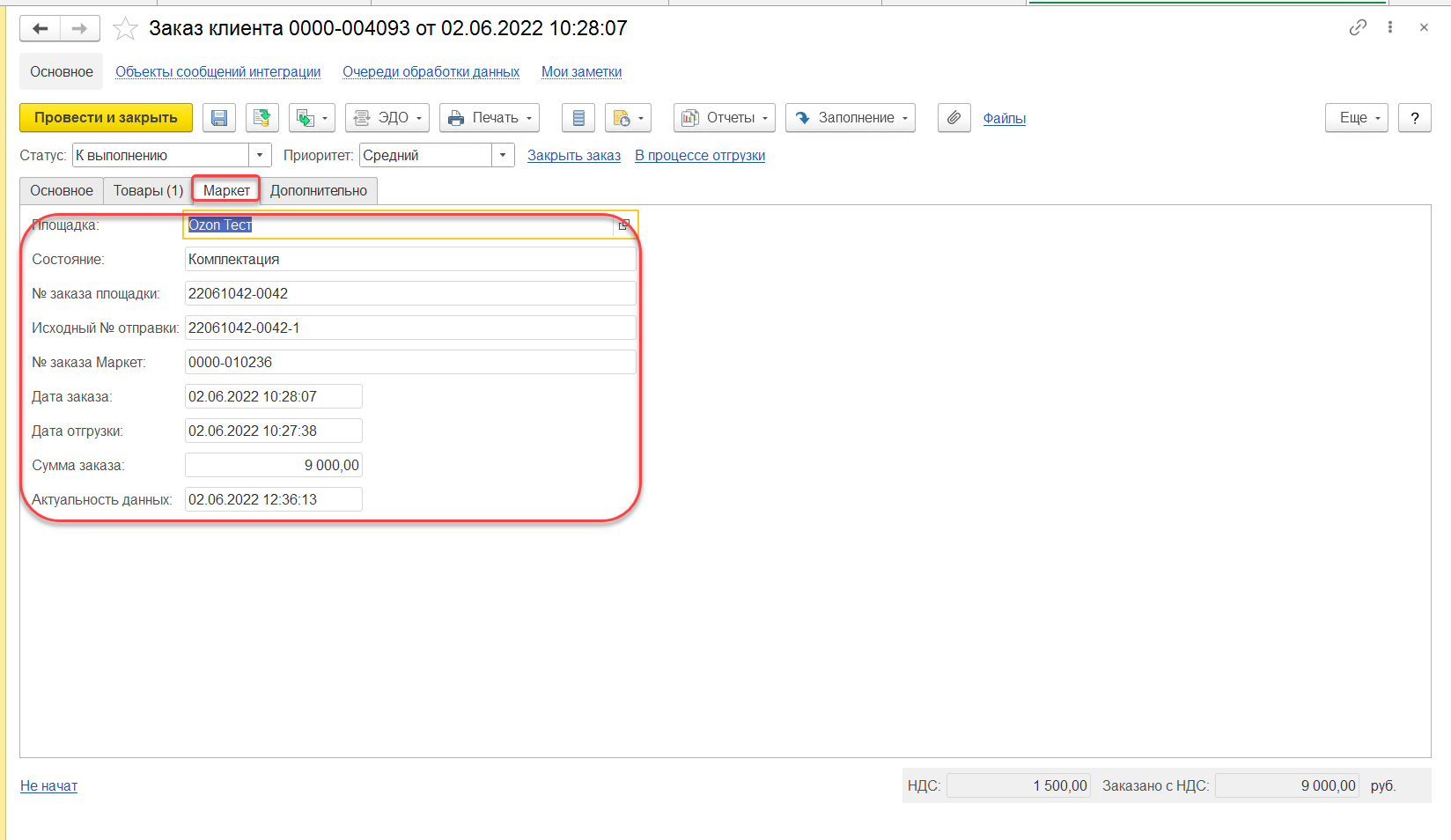 Необходимо проверить, чтобы все реквизиты били заполнены на основании настроек создания заказов, была вкладка "Маркет" и на данной вкладке были заполнены данные заказа маркептлейса.