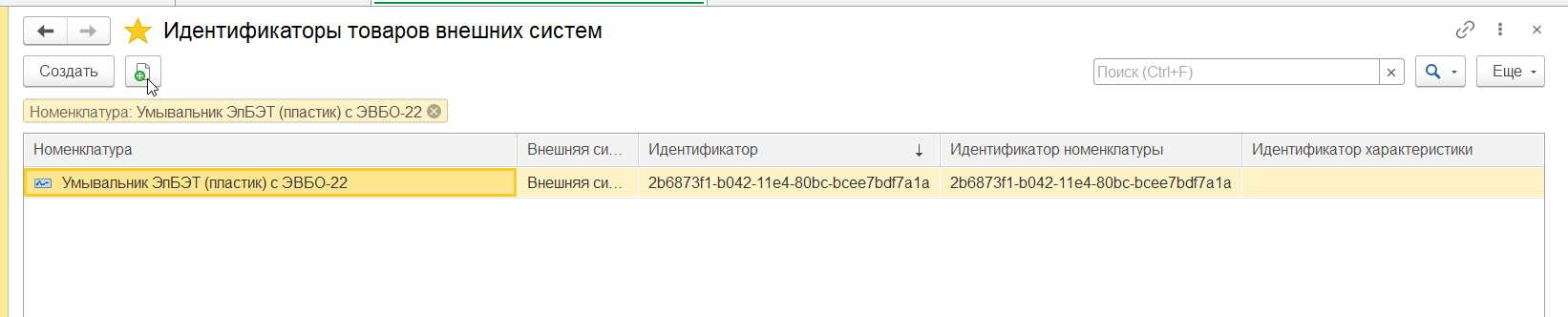 После выполнения очередей необходимо проверить данные в RDV Маркет. Для проверки выгрузки номенклатуры необходимо зайти в журнал "Идентификаторы товаров внешних систем". В нем должна быть запись по выгруженной номенклатуре из Коннектора.