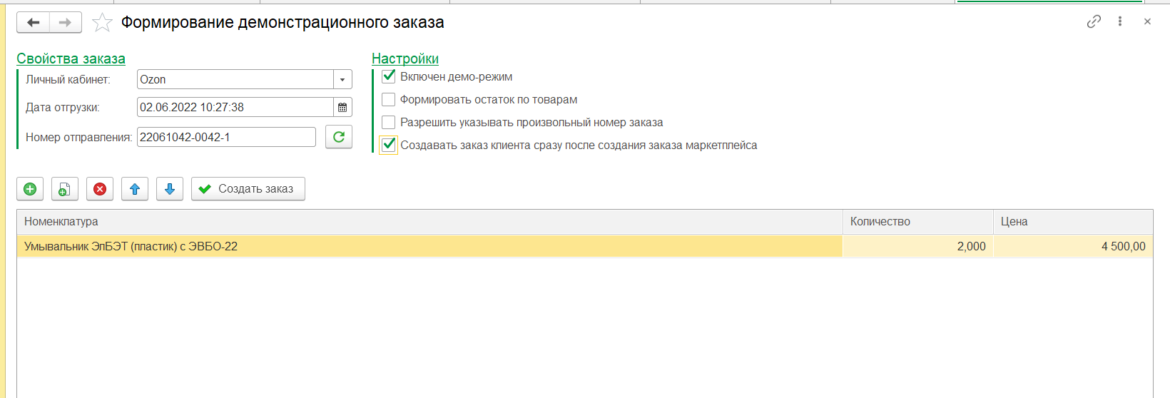 Для проверки загрузки заказов необходимо создать демо-заказ в RDV Маркет.