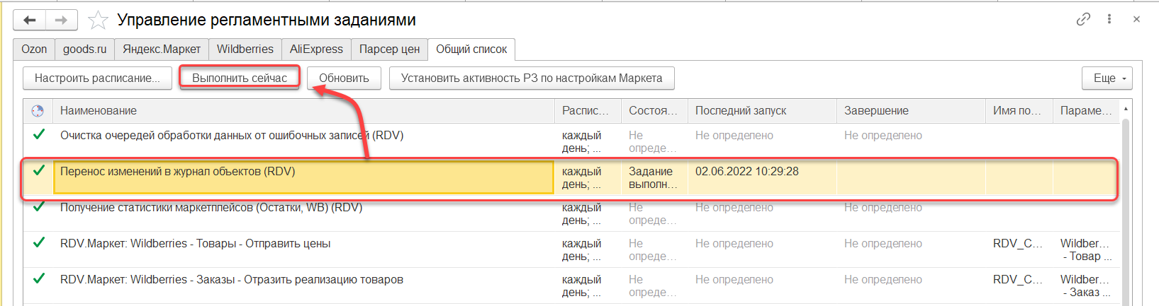 Далее в журнале обработки данных необходимо обработать очередь" Обработка заказов Маркет".