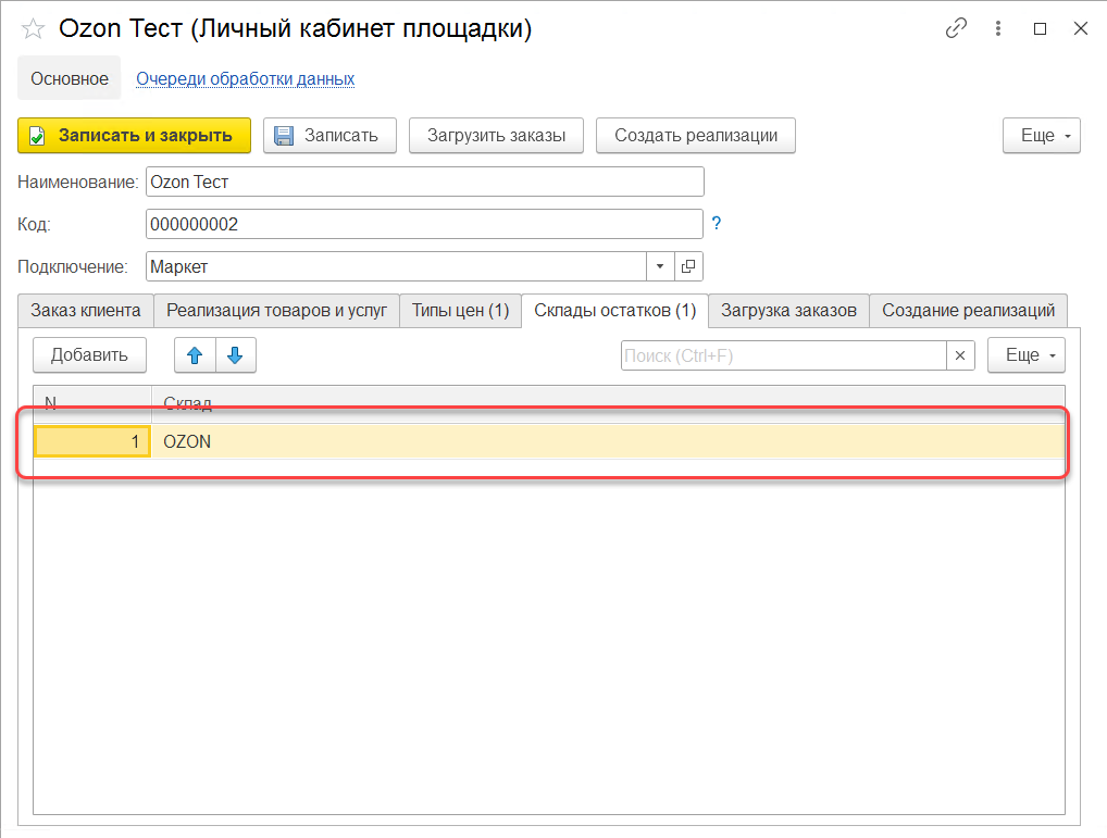 Необходимо заполнить вкладку "Склады остатков", добавить сроку и указать склад, с которого будет выполнятся трансляция остатков в RDV Маркет.