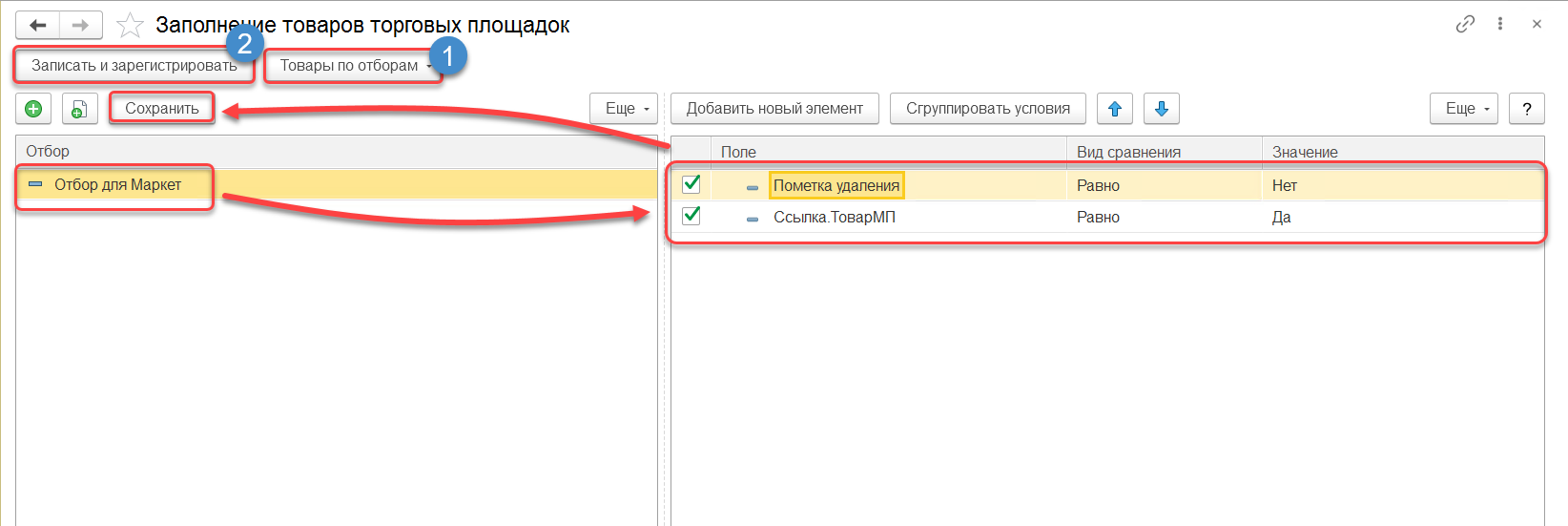 Далее необходимо настроить отбор по товарам, которые будут выгружены в RDV Маркет и по которым будет происходить обмен ценами и остатками. Это делается в обработке "Заполнение товаров торговых площадок". В таблице "Отбор" необходимо добавить новый отбор. В окне настроек отборов необходимо указать варианты отбора (можно указать "Ссылка" - "Равно" - указать конкретный товар). После настройки отбор необходимо сохранить. По кнопке "Товары по отборам (на рис. - 1) можно посмотреть список товаров, которые будут зарегистрированы для обмена. После настроек необходимо нажать кнопку "Записать и зарегистрировать" (на рис. - 2) и выполнить регистрацию товаров.