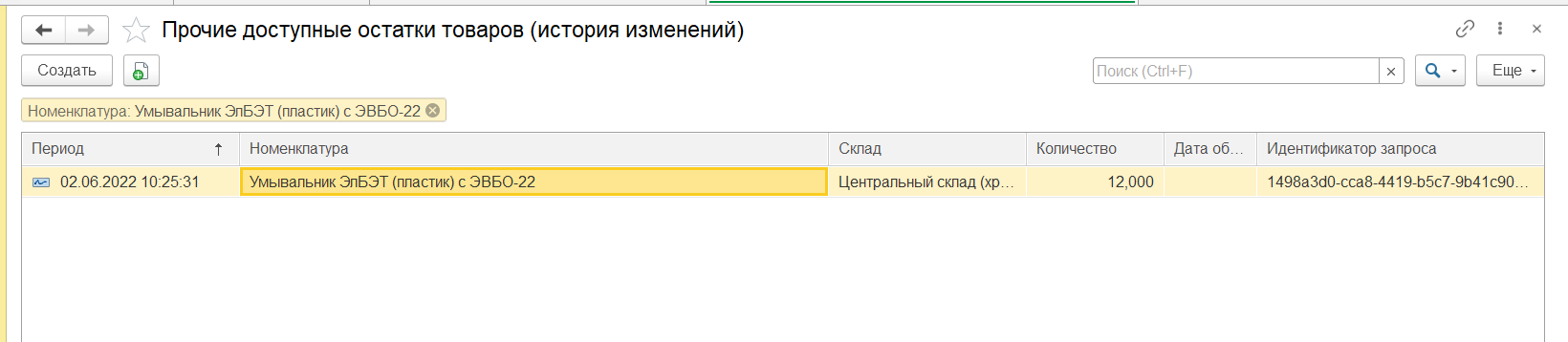 Проверка остатков выполняется в журнале "Прочие доступные остатки товаров (история изменения)". В Журнале должна быть запись по выгруженной номенклатуре. Необходимо проверить, совпадает ли остаток в RDV Маркет и свободный остаток по выбранному сладу в Коннекторе.