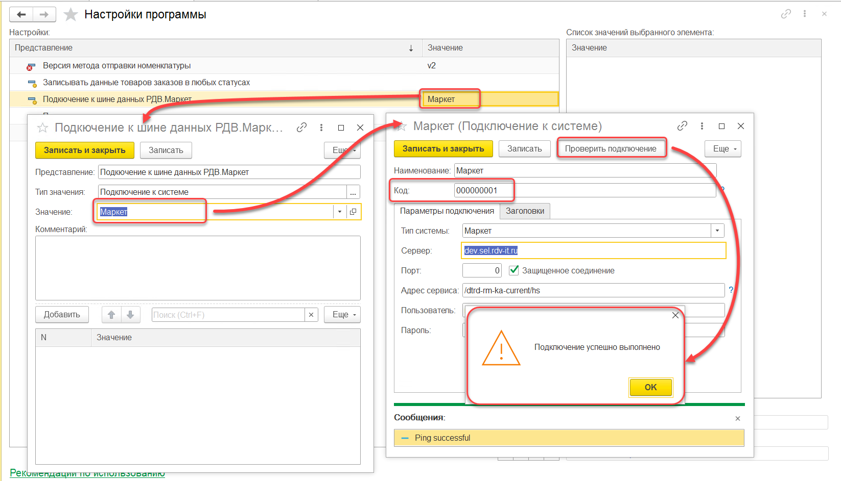 В Коннекторе необходимо выполнить настройки подключения к системе. В настройках необходимо новое подключение к шине данных (если его нет), создать (если его нет) и настроить подключение к системе. В подключении к системе необходимо указать код внешней системы в RDV Маркет (Код (ключ поиска)). Далее необходимо выбрать тип системы "Маркет", указать сервер и адрес базы (примеры приведены на рис.). Необходимо указать пользователя и пароль подключения к базе RDV Маркет. Далее необходимо проверить подключение, нажав кнопку "Проверить подключение".
