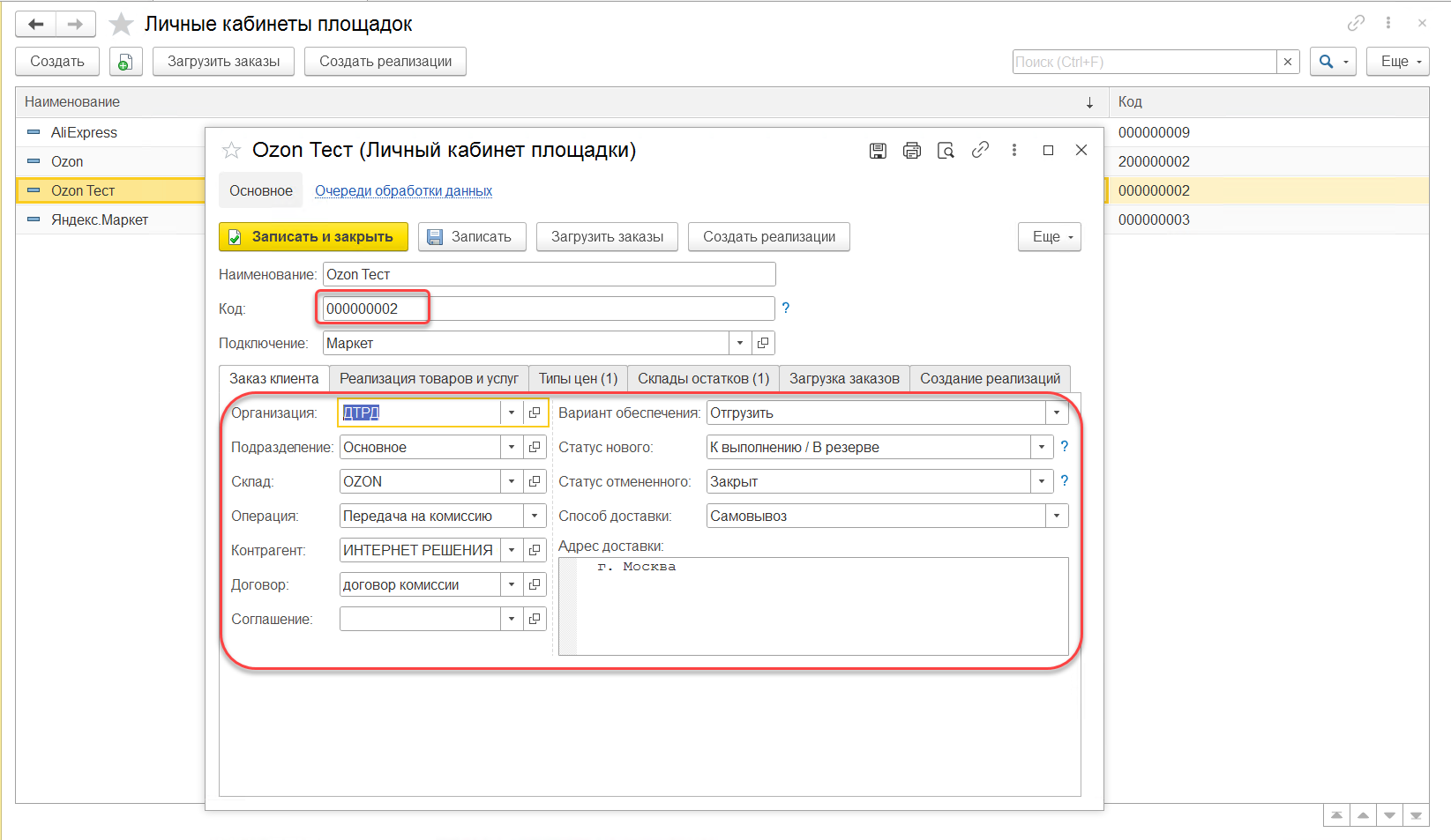 В Коннекторе необходимо создать личный кабинет площадок. В качестве кода необходимо указать внутренний идентификатор личного кабинета из RDV Маркет. Необходимо заполнить все реквизиты на вкладук "Заказ клиента". На основании этих данных будет заполняться заказ клиента.