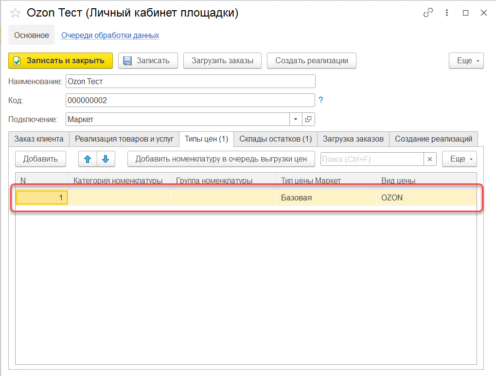Необходимо заполнить вкладку "Типы цен", добавить 2 строки с типами цен "Базовая" и "Без скидки" (тип цен "Без скидки" используется только для Ozon и Я.М) и указать вид цен.