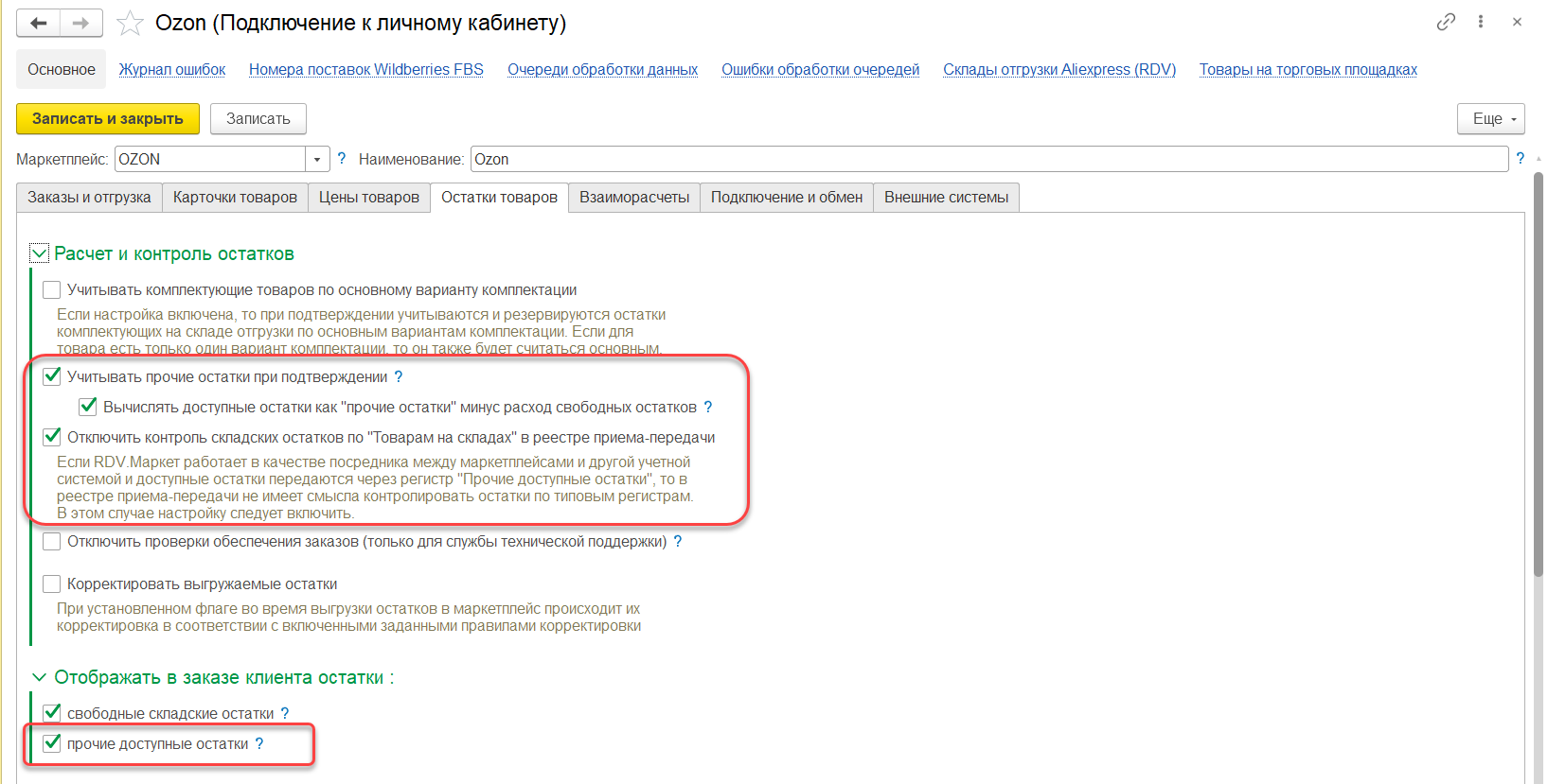 Необходимо в RDV Маркет в подключении к личному кабинету, на котором будет происходить тестирование, необходимо установить флажки: "Учитывать прочие остатки при подтверждении", "Вычислять доступные остатки как "Прочие остатки" минус расход свободных остатков", "Отключить контроль складских остатков "Товары на складах" в реестрах приема-передачи", "Прочие доступные остатки"