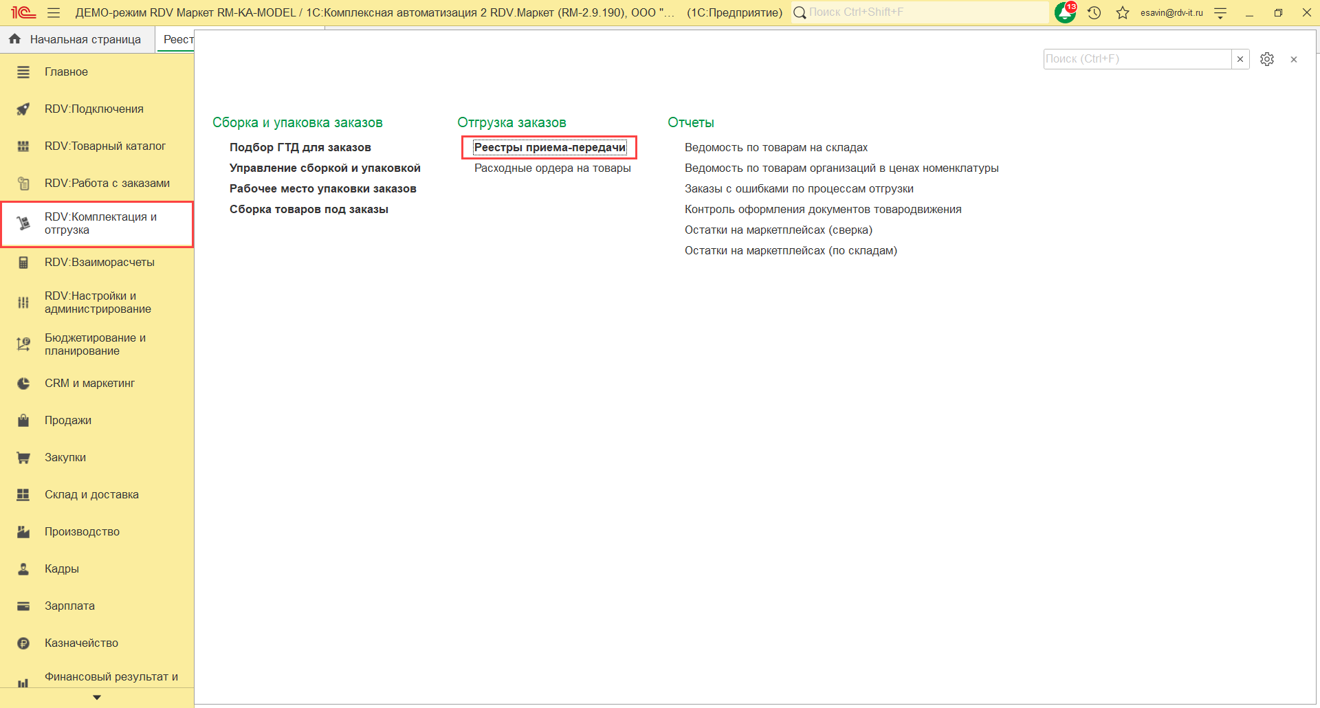 Реестры приема-передачи находятся в разделе "RDV:Комплектация и отгрузка"