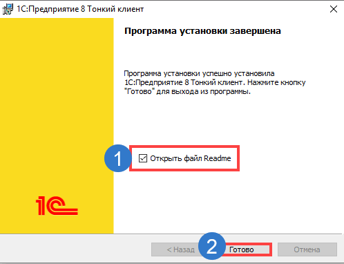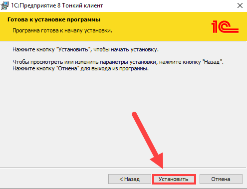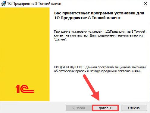 Появится окно установки тонкого клиента 1С. Нажмите несколько раз кнопку"Далее", после чего нажмите кнопку"Установить".