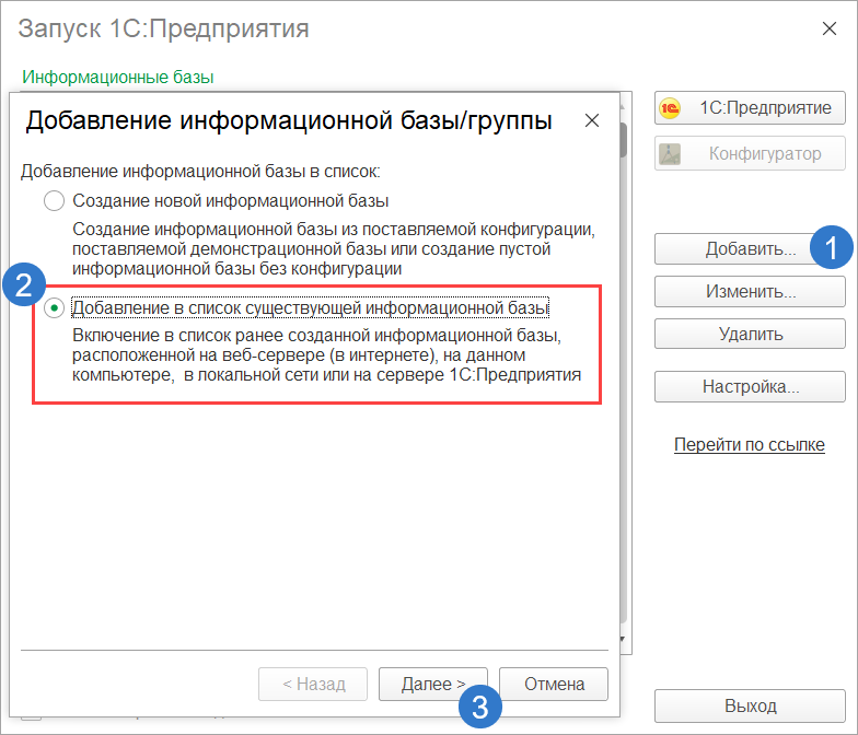 Выберите"Добавление в списоксуществующей информационнойбазы".