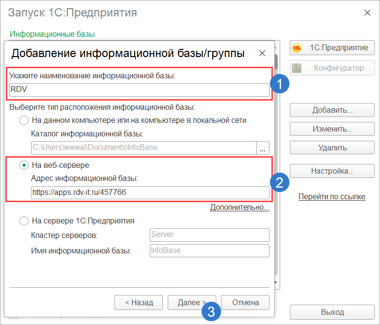 Выберите тип расположения"На веб-сервере"и укажите адрес информационной базы.