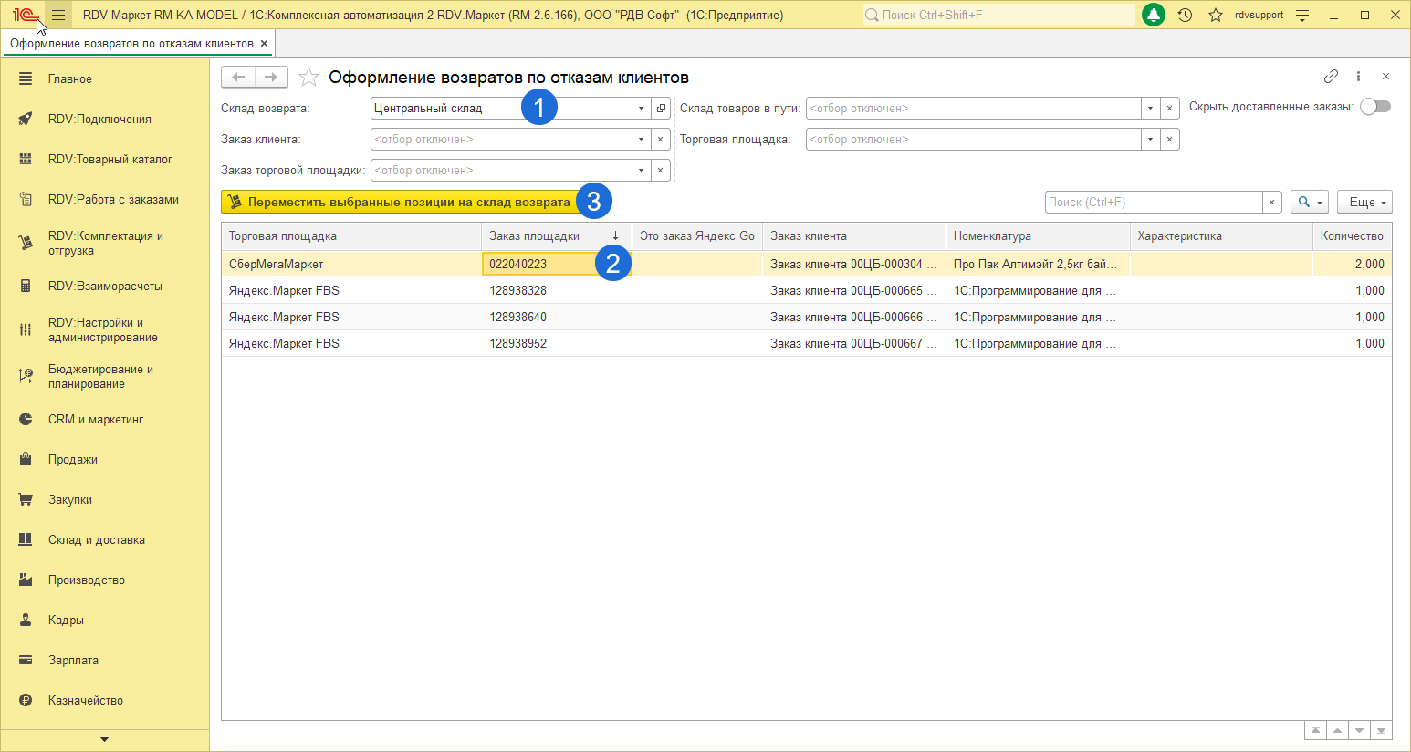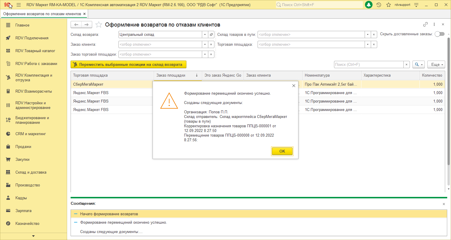 3. Нажать на кнопку "Переместить выбранные позиции на склад возврата"