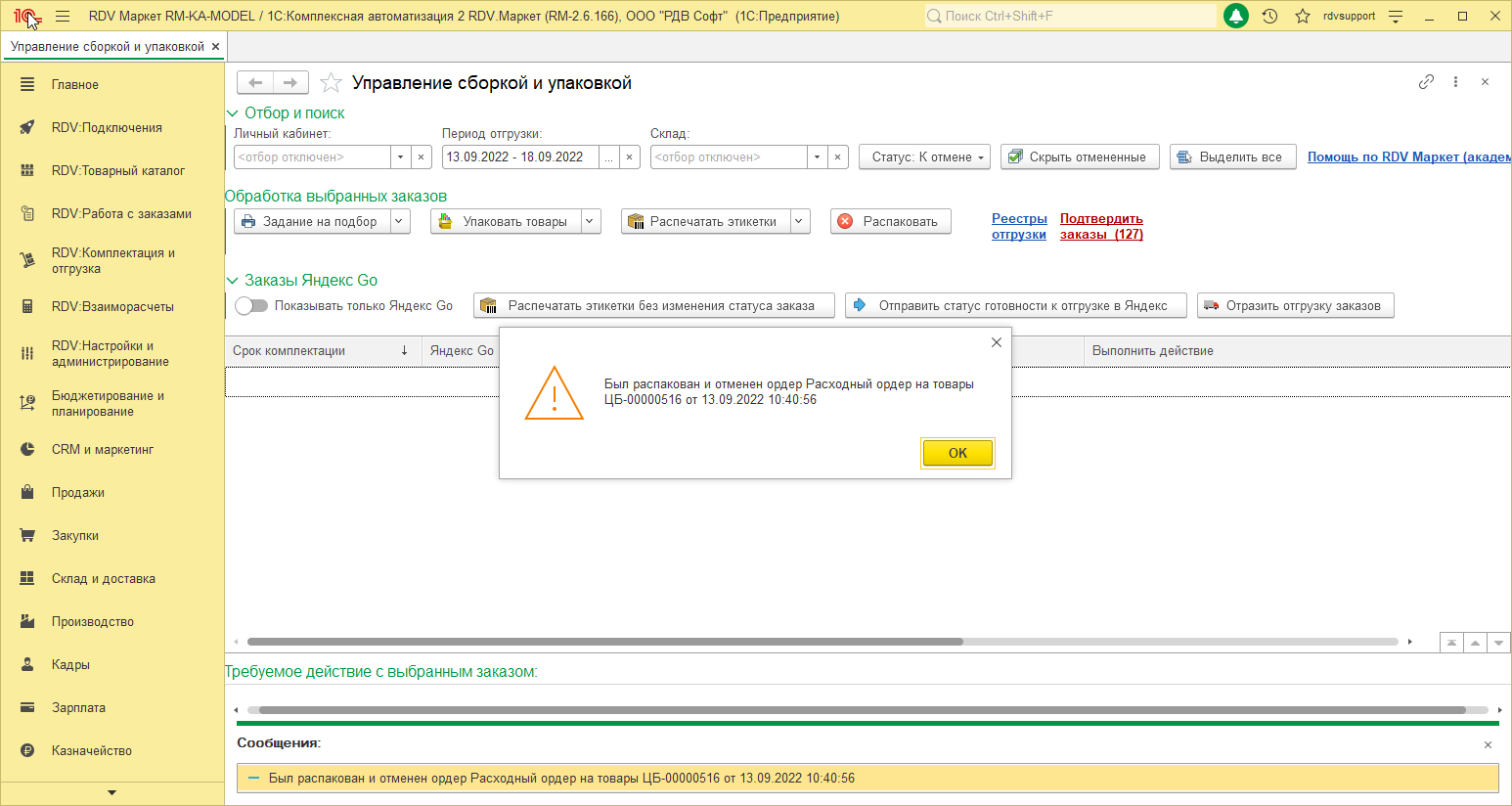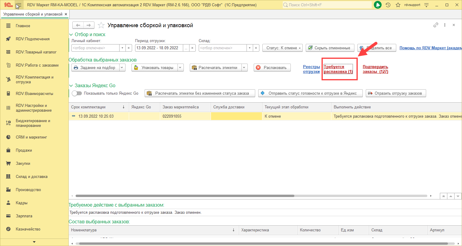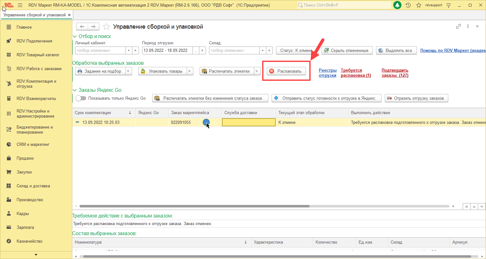 В данном случае резерв с товара снимается автоматически, но сам товар необходимо распаковать. Для этого перейдите в раздел "RDV:Комплектация и отгрузка" - "Управление сборкой и упаковкой":