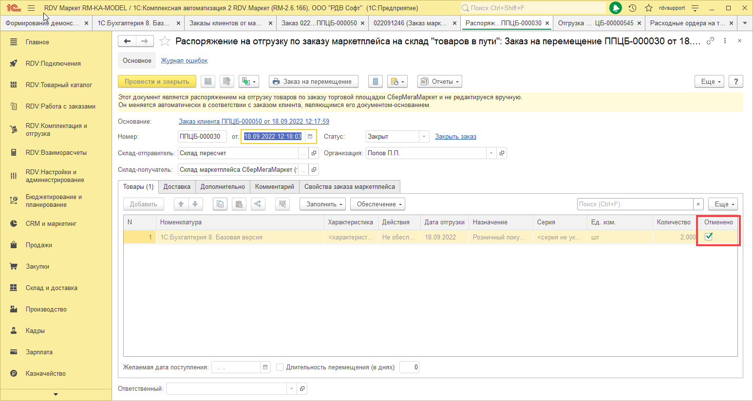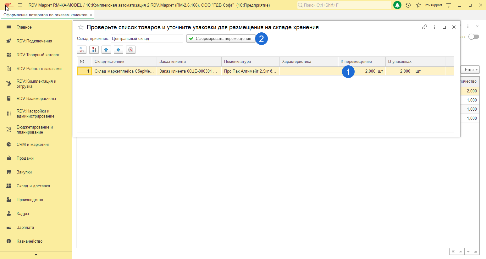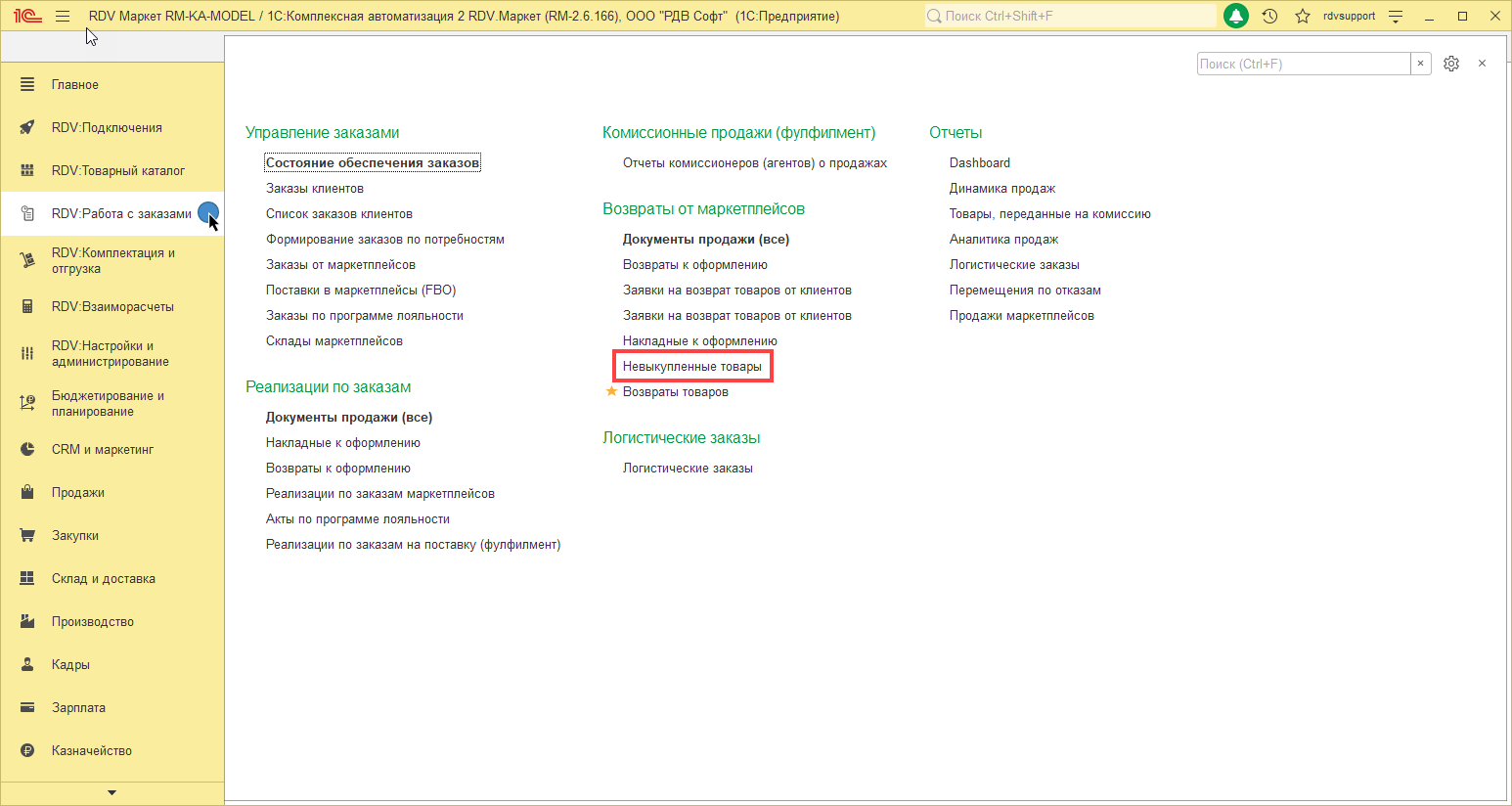 В данном случае резерв с товара снимается автоматически, но сам товар необходимо распаковать. Для этого перейдите в раздел "RDV:Комплектация и отгрузка" - "Управление сборкой и упаковкой":