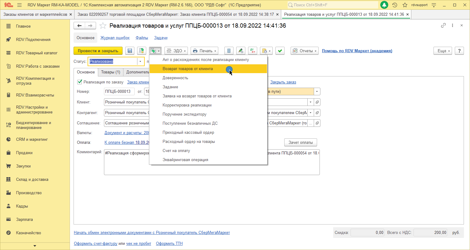 Для того, чтобы оформить возврат, по которому была отражена реализация заказа (то есть покупатель оплатил заказ, забрал его, а потом решил вернуть), необходимо зайти в документ "Реализация товаров и услуг" по данному заказу.