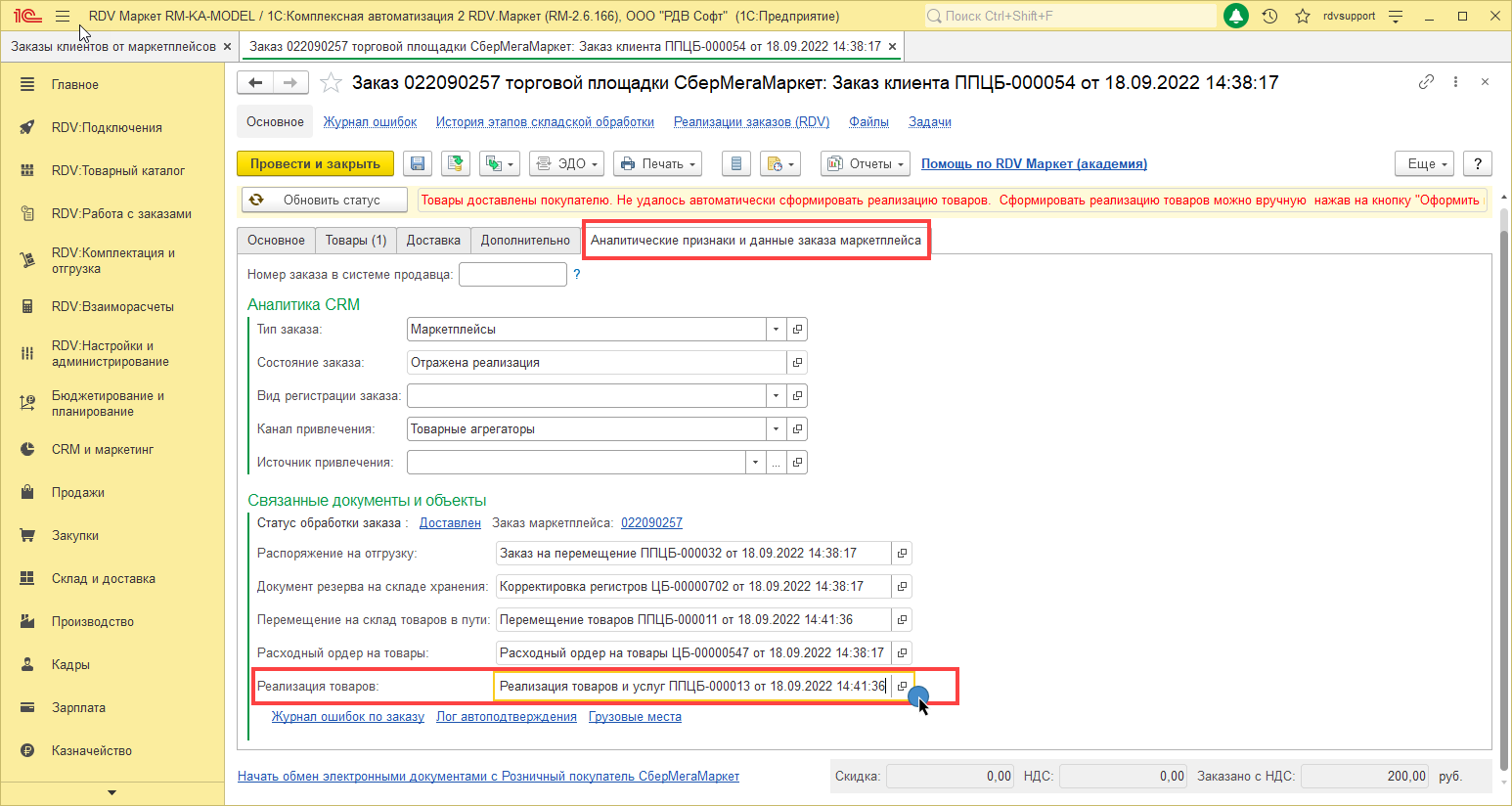 Для этого в заказе маркетплейса перейти на вкладку "Аналитические признаки и данные заказа маркетплейса" - "Реализация товаров и услуг":